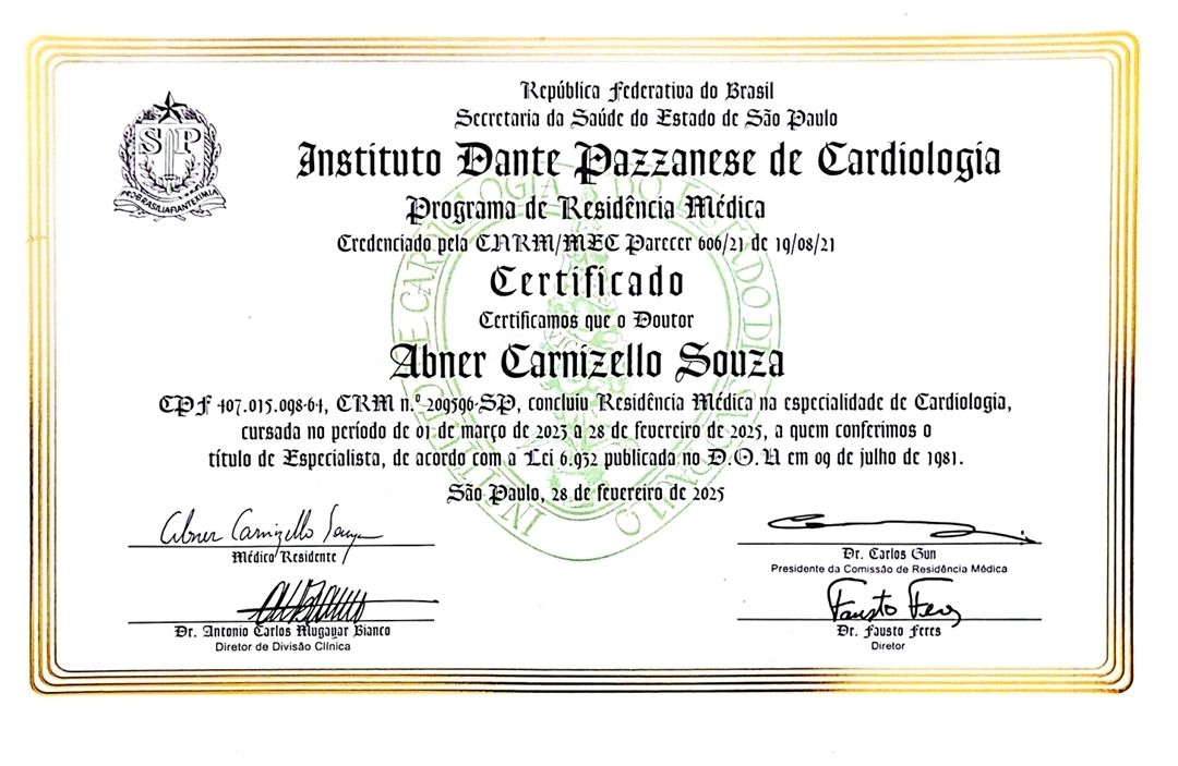 Quais são as principais especialidades de Abner Carnizello Souza?Abner Carnizello Souza é cardiologista. Te mostramos alguns dos serviços oferecidos pelo especialista graças à sua trajetória e vasta experiência: Primeira consulta Cardiologia, Avaliação pré-operatória, Avaliação do risco cirúrgico, Consulta cardiologista, ECG (eletrocardiograma), Check up, Análise de triglicerídeos, Aferição da pressão arterial , Avaliação cardiológica para atletas, Consulta Cardiologia.