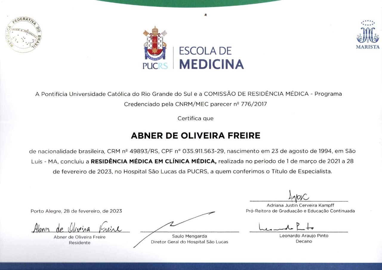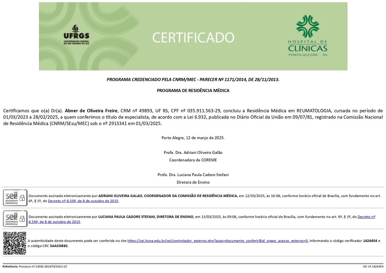 Sou graduado pela Universidade Federal do Maranhão (Sede), tenho residência em Medicina Interna pelo Hospital São Lucas da PUCRS e em Reumatologia pelo Hospital de Clínicas de Porto Alegre (UFRGS). Trabalho dedicado ao cuidado de pessoas com doenças reumatológicas e síndromes dolorosas, priorizando a abordagem empática, individualizada e fundamentada em evidências científicas.