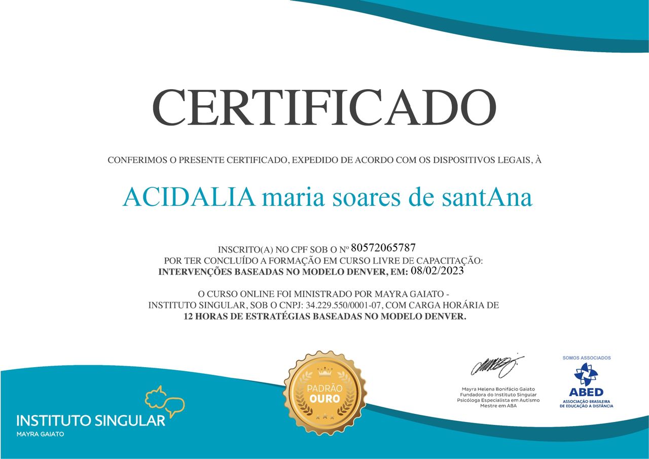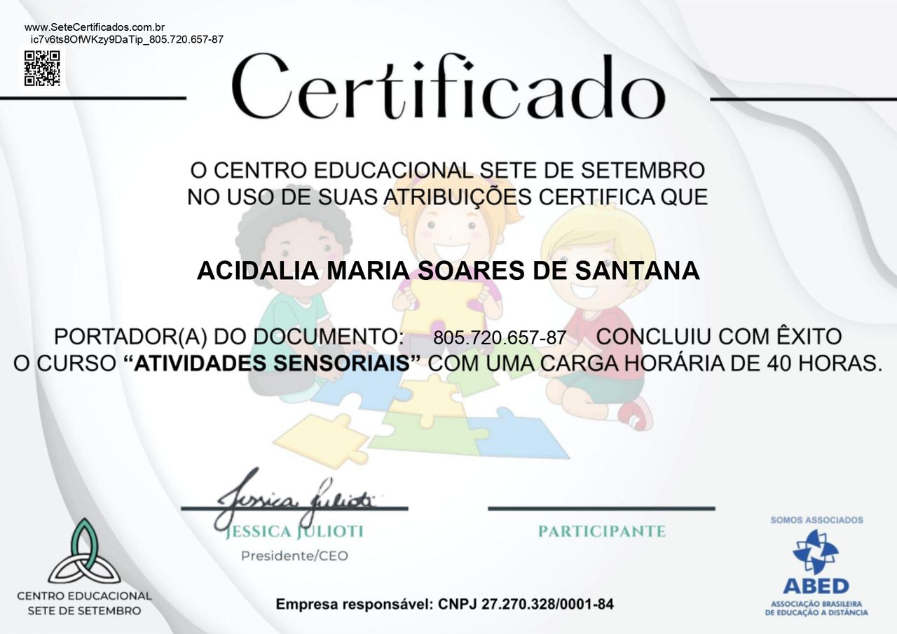 Quais são as principais especialidades de Acidália Maria Soares de Sant Ana?Acidália Maria Soares de Sant Ana é terapeuta complementar. Te mostramos alguns dos serviços oferecidos pelo especialista graças à sua trajetória e vasta experiência: Psicomotricidade infantil, Atendimento para TEA e TDAH (infantil).