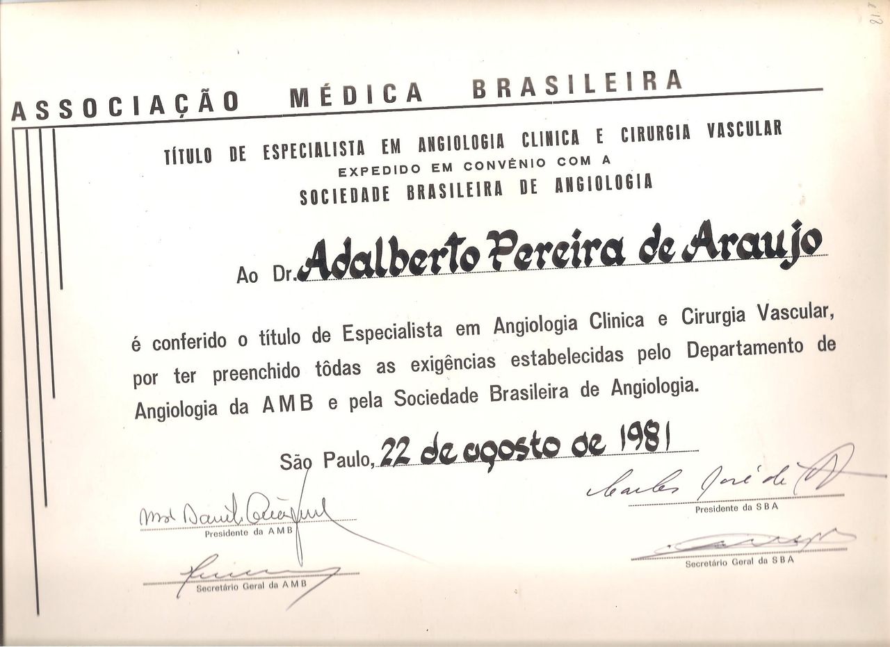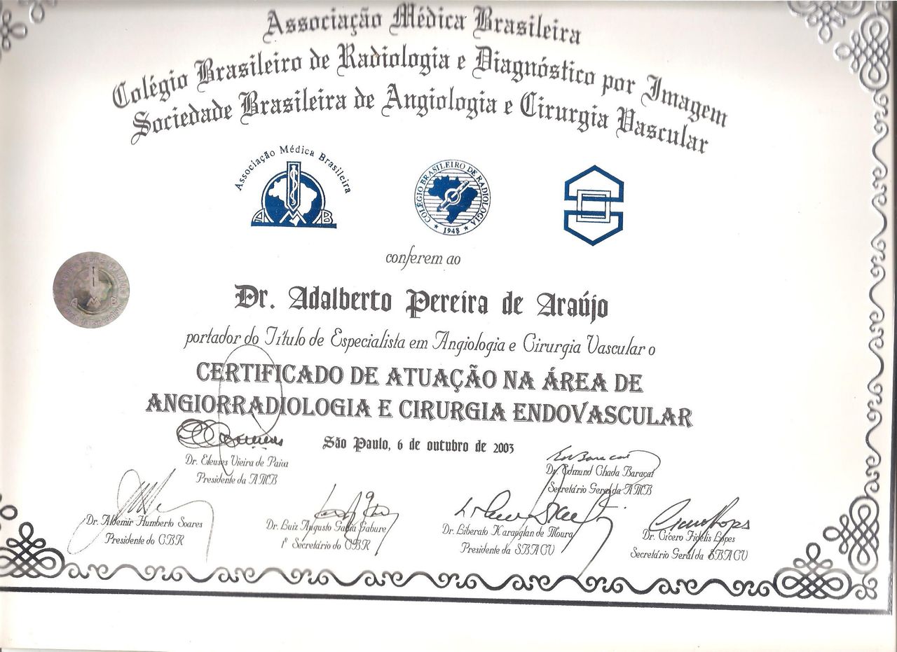 Dr. Adalberto Pereira de Araújo é médico especialista em Cirurgia Vascular, Cirurgia Endovascular e Angiologia. Com ampla experiência no cuidado da saúde vascular, dedica-se ao atendimento humano, atencioso e individualizado para cada paciente.