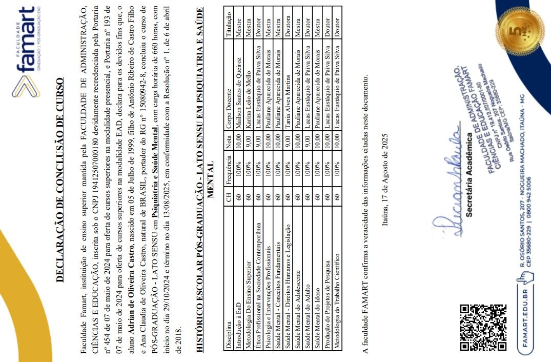SOU MÉDICO FORMADO PELA UNIVERSIDADE FEDERAL DO PARANÁ (UFPR). RESIDENTE EM PSIQUIATRIA PELA UNIVERSIDADE FEDERAL DE CIENCIAS DA SAUDE DE PORTO ALEGRE - (UFCSPA). ESPECIALIZAÇÃO LATU SENSU EM PSIQUIATRIA (NÃO ESPECIALISTA). ESPECIALIZAÇÃO LATU SENSU EM DIREITOS HUMANOS. APROVADO NO CONCURSO PÚBLICO PARA PERITO MÉDICO OFICIAL - PSIQUIATRA, PELA POLICIA CIENTÍFICA DO ESTADO DO PARANÁ.