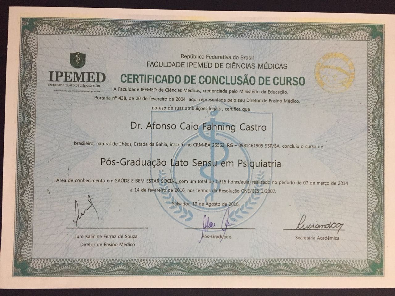 O Dr. Afonso Caio Fahning Castro é médico psiquiatra titulado, com Registro de Qualidade de Especialista (RQE), 12 anos de experiência e professor de faculdade de medicina. Atua com dedicação e cuidado especializado em saúde mental, unindo prática clínica, ensino e atualização científica.