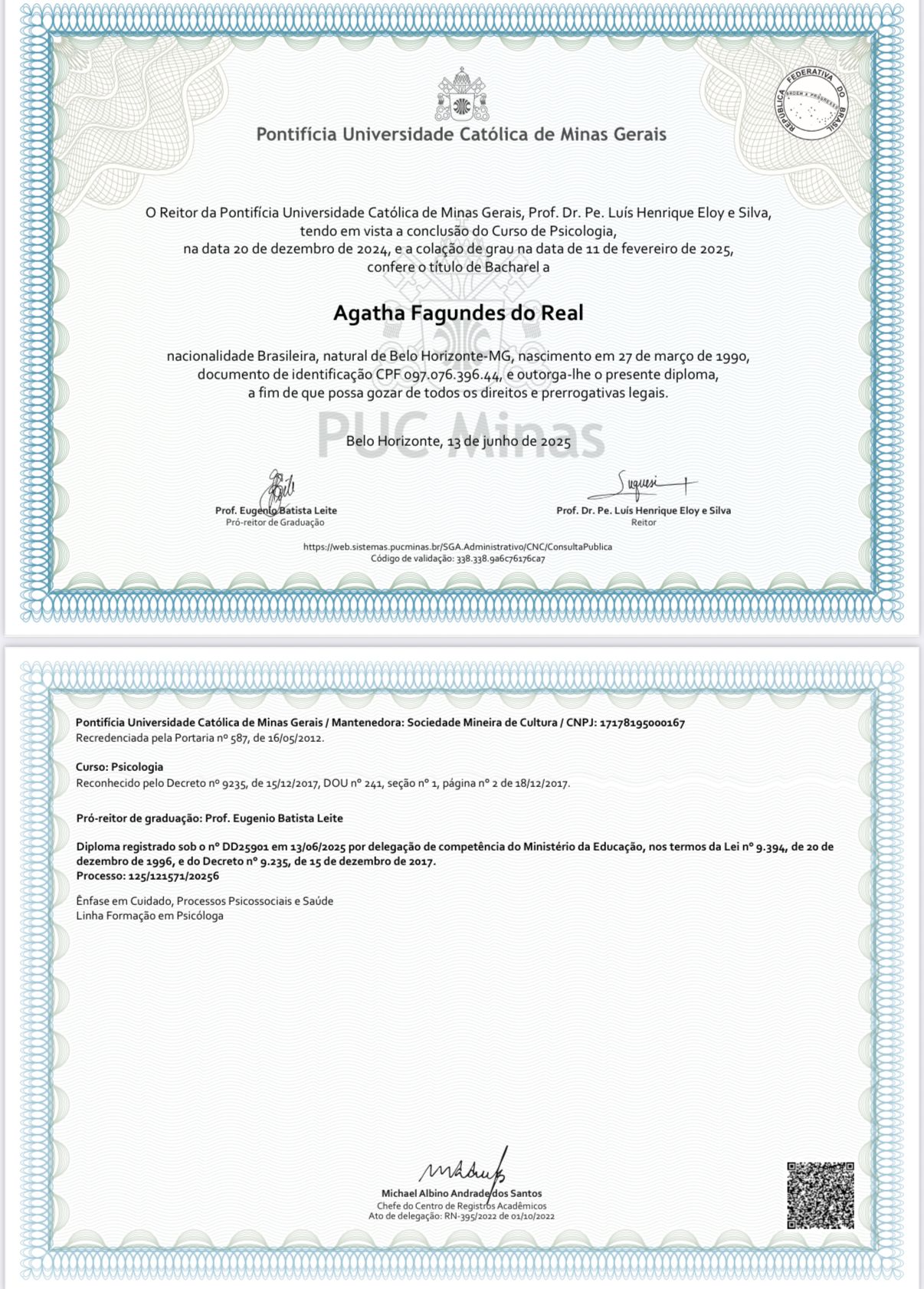 Oi, meu nome é Ágatha Real. Sou psicóloga com formação em psicanálise e tenho experiência atendendo adolescentes e adultos. Gosto muito de trabalhar com escuta acolhedora e ética, ajudando as pessoas a entenderem melhor suas questões, promovendo a saúde mental dos pacientes.