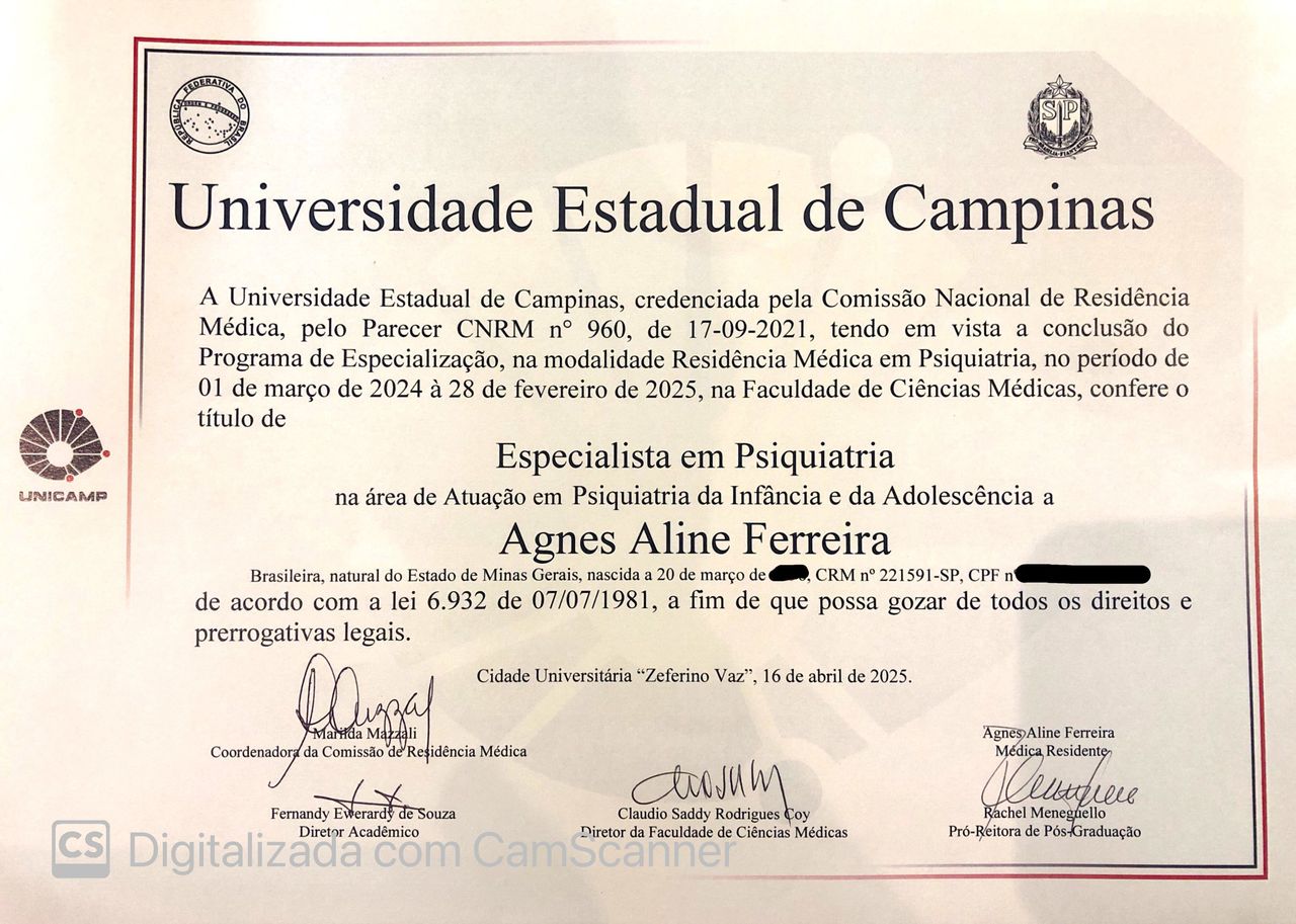 Formada em medicina pelo Imepac Araguari. Iniciei minha carreira atuando como segundo tenente no hospital da Força Aérea Brasileira em Brasília. Em seguida cursei residência médica de Psiquiatria no Instituto Américo Bairral, o maior complexo de saúde mental da América Latina. E residência médica em Psiquiatria da Infância e da Adolescência na Unicamp.