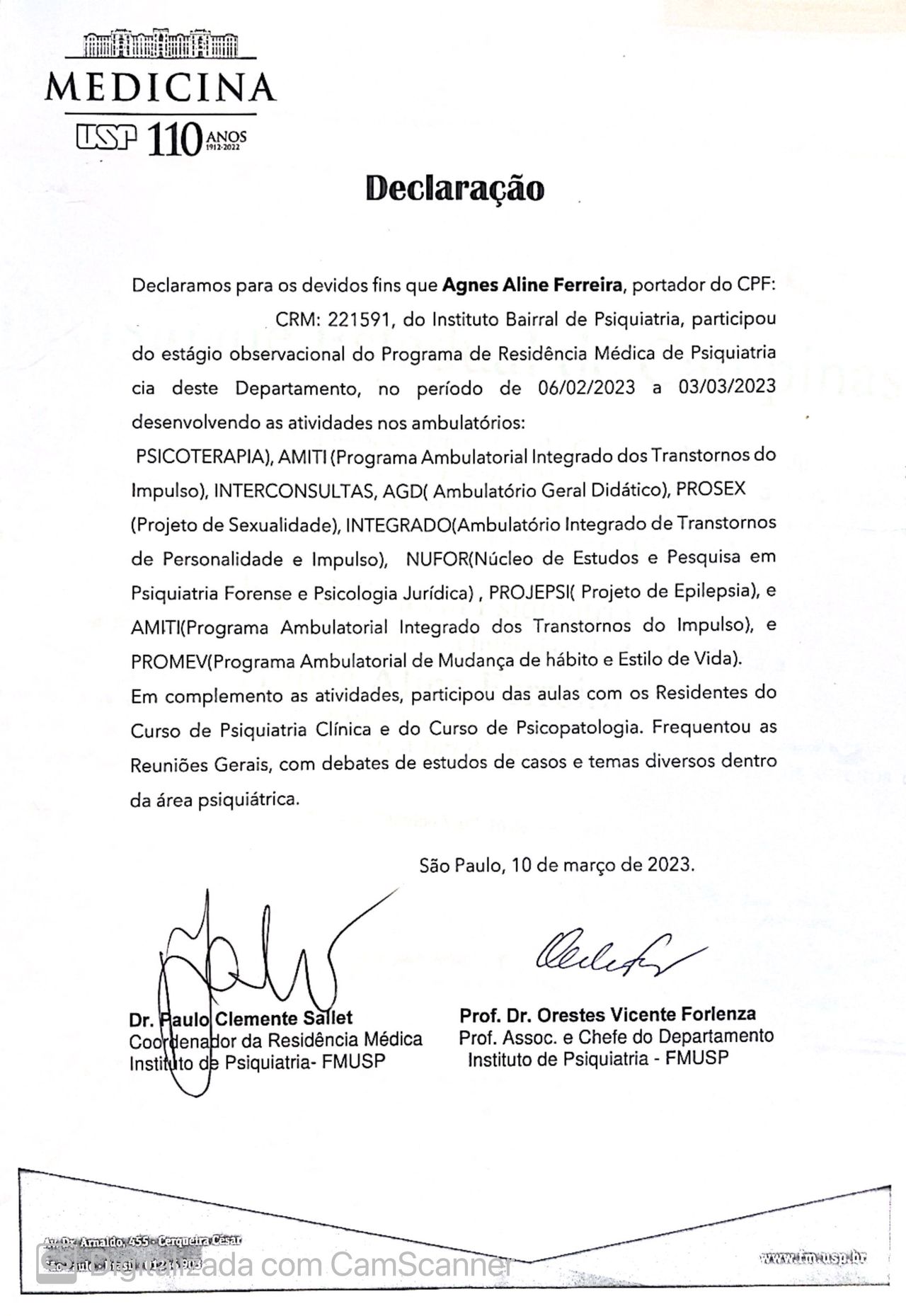 Quais são as principais especialidades de Agnes Aline Ferreira?Agnes Aline Ferreira é psiquiatra. Te mostramos alguns dos serviços oferecidos pelo especialista graças à sua trajetória e vasta experiência: Acompanhamento de pacientes adultos, Atendimento psiquiátrico de crianças e adolescentes, Tratamento da ansiedade, Psicoterapia adulto, Tratamento da depressão, Acompanhamento de crianças, Primeira consulta Psiquiatria.