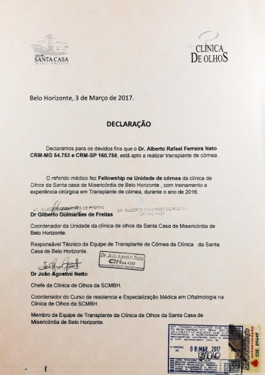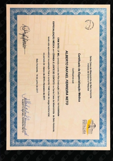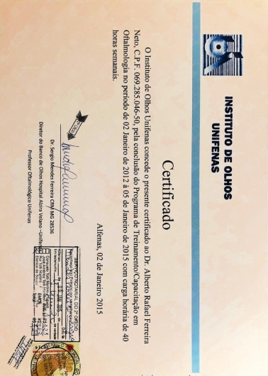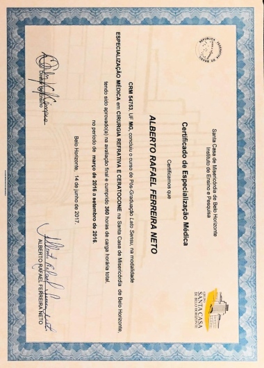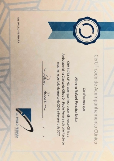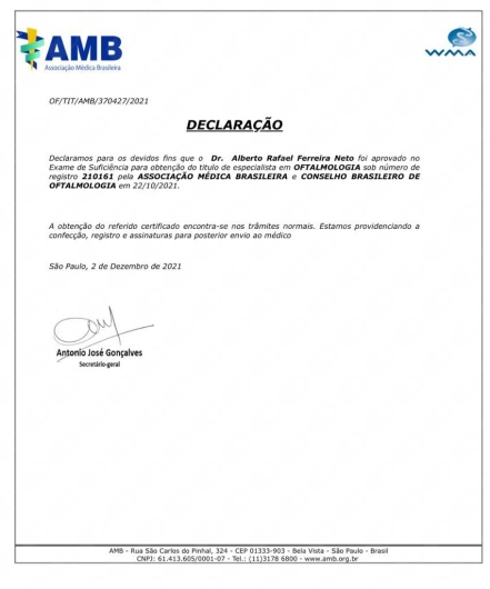 Quais são as principais especialidades de Alberto Rafael Ferreira Neto?Alberto Rafael Ferreira Neto é oftalmologista. Te mostramos alguns dos serviços oferecidos pelo especialista graças à sua trajetória e vasta experiência: Consulta generalista, Primeira consulta Oftalmologia, Exames Oftalmológicos, Capsulotomia yag laser, Tomografia da córnea (Pentacam), Ceratoscopia computadorizada, Paquimetria ultrassonica, Campimetria visual computadorizada, Teste de lente, Análise e solicitação de exames.