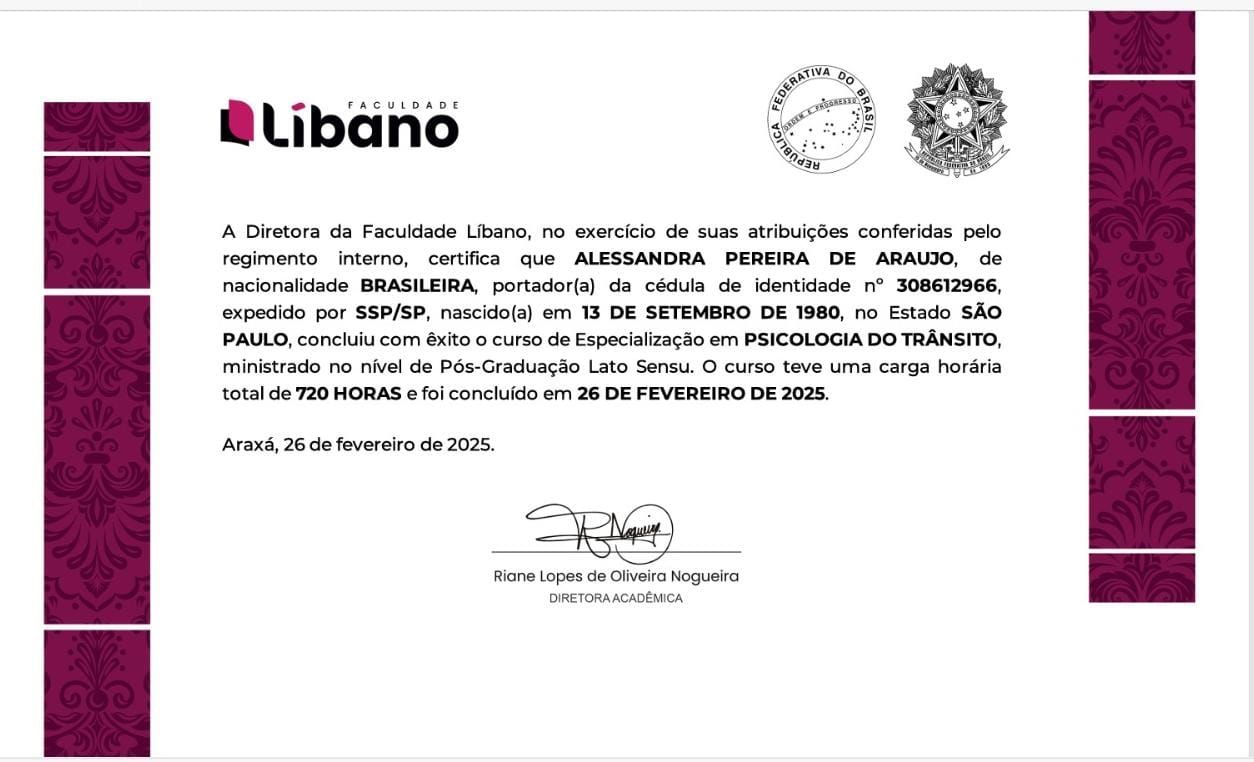 Graduada em Psicologia, possui MBA em Gestão Estratégica e Econômica de Recursos Humanos, Pós-graduação em Psicologia do Trânsito, Pós-graduação em Terapia Cognitivo-Comportamental (TCC) e é pós-graduanda em Neuropsicologia, consolidando uma carreira marcada pela integração entre ciência, técnica e prática clínica baseada em evidências.