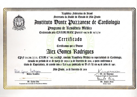 Ao fim da formação, alcancei a conquista do título de especialista pela sociedade brasileira de cardiologia, ficando em 3° lugar geral do Brasil na prova de proficiência do ano de 2018.
