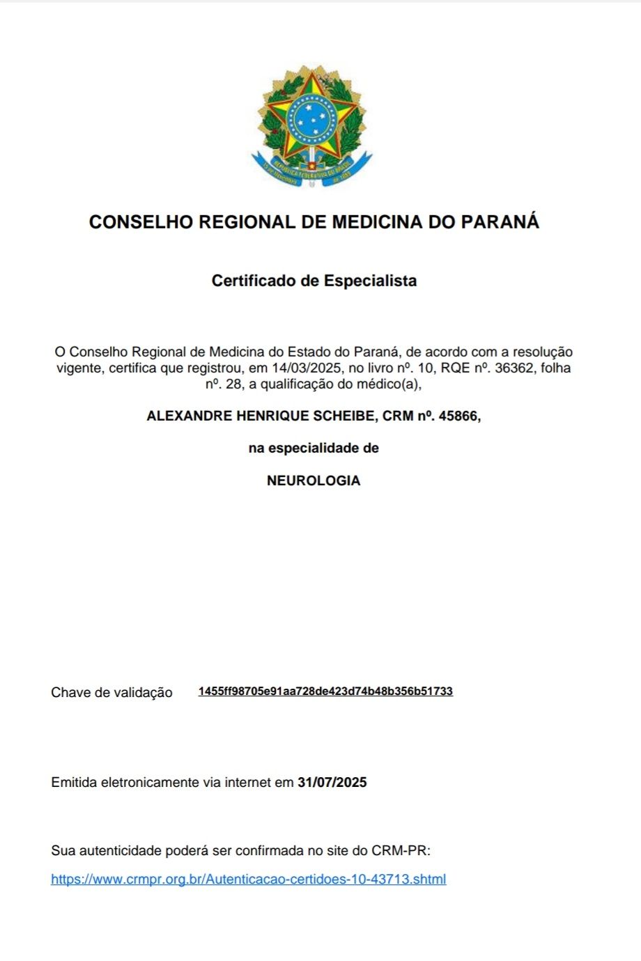 Quais são as principais especialidades de Alexandre Henrique Scheibe?Alexandre Henrique Scheibe é neurologista. Te mostramos alguns dos serviços oferecidos pelo especialista graças à sua trajetória e vasta experiência: Consulta neurologia, Consulta Neurologia Pediátrica, Primeira consulta neurologia, Consulta Neurologista, Aplicação da toxina botulinica para dor neuropatico, Acompanhamento neuropsicológico demências, Consulta de neurologia clínica, Primeira consulta neurologista, Transtorno de déficit de atenção e hiperatividade - TDAH, Teleconsulta.