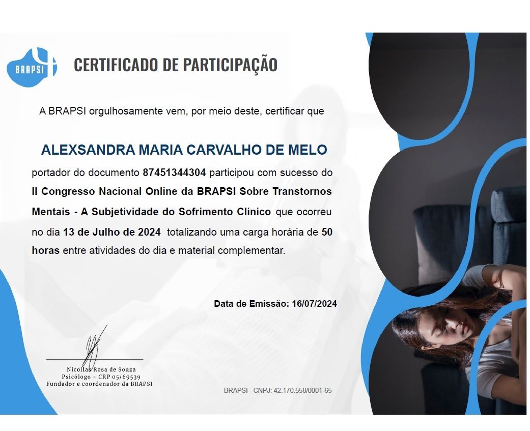 Acredito na psicoterapia como um processo de autoconhecimento e transformação, onde cada pessoa é acolhida em sua singularidade. Atuo com foco em questões como ansiedade, estresse, autoestima, dificuldades emocionais e relacionamentos, sempre respeitando o tempo e as necessidades de cada paciente.