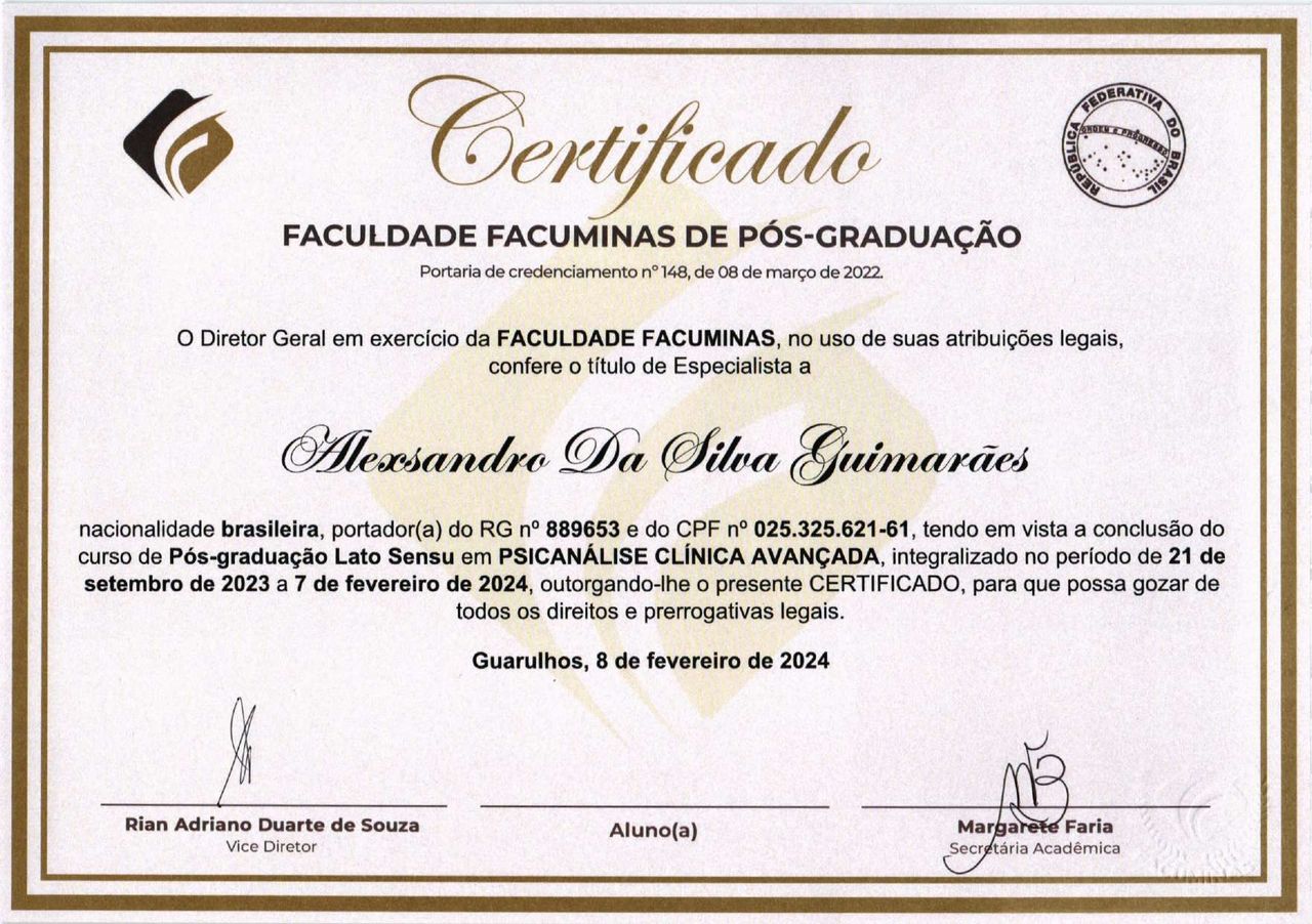 Quais são as principais especialidades de Alexsandro da Silva Guimarães?Alexsandro da Silva Guimarães é psicanalista. Te mostramos alguns dos serviços oferecidos pelo especialista graças à sua trajetória e vasta experiência: Teleconsulta, Psicanálise, Terapia de Casal, Terapia de Família, Consulta em psicanálise online, Primeira consulta psicanálise, Psicoterapia, Tratamento da ansiedade, Orientação Vocacional, Terapia Familiar.