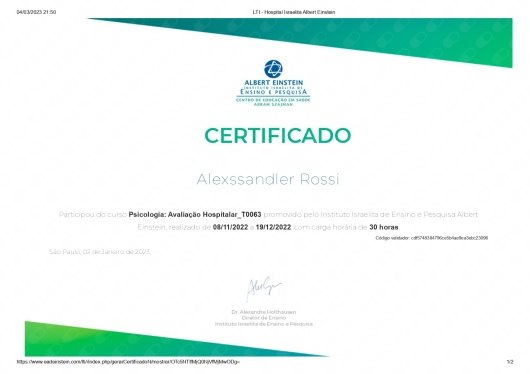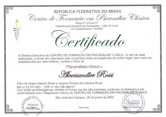 Olá! Sou Alexssandler Rossi, graduado em Psicologia, pós graduado em Perícia Judicial, com especialização em Psicanálise Clínica, e pós graduando em Neuropsicologia pela PUC, atuo como psicólogo clínico no Hospital Psiquiátrico Francisca Júlia, referência em saúde mental, psiquiatria e dependência química no Vale do Paraíba, interior de São Paulo, e em consultório próprio presencial e online, em português e Libras na cidade de São José dos Campos. Com experiência no atendimento de Urgência e Emergência, Autoconhecimento, Divórcio/Separação, Suicidologia e tratamentos de Transtorno de Ansiedade, Transtorno Depressivo, Transtorno Afetivo Bipolar, Transtorno de Personalidade Borderline, Transtorno de Personalidade Narcísica (TPN), Transtorno Obsessivo-compulsivo (TOC) e Transtorno de Estresse Pós-Traumático. Minha abordagem Psicanalítica Clínica é especializada, contribuindo para a manutenção da saúde psíquica e promovendo maior autonomia e qualidade de vida do paciente, em um ambiente seguro, acolhedor e sigiloso, conforme determina a ética profissional do psicólogo. Estou à disposição para te auxiliar e caminhar junto com você em seu processo. Qualquer dúvida entre em contato!
