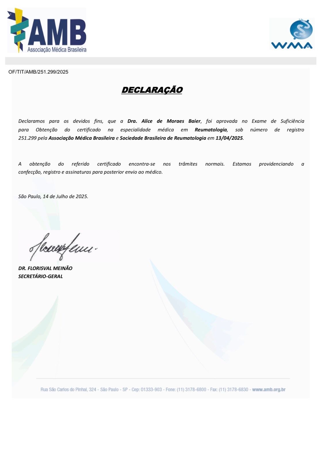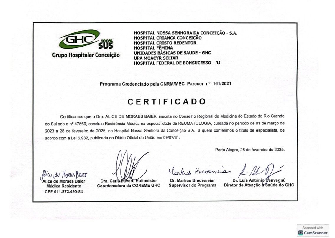 Sou formada em Medicina pela Universidade de Santa Cruz do Sul (UNISC). Realizei a primeira residência em Medicina Interna e a segunda residência em Reumatologia no Hospital Nossa Senhora Conceição em Porto Alegre-RS (GHC).