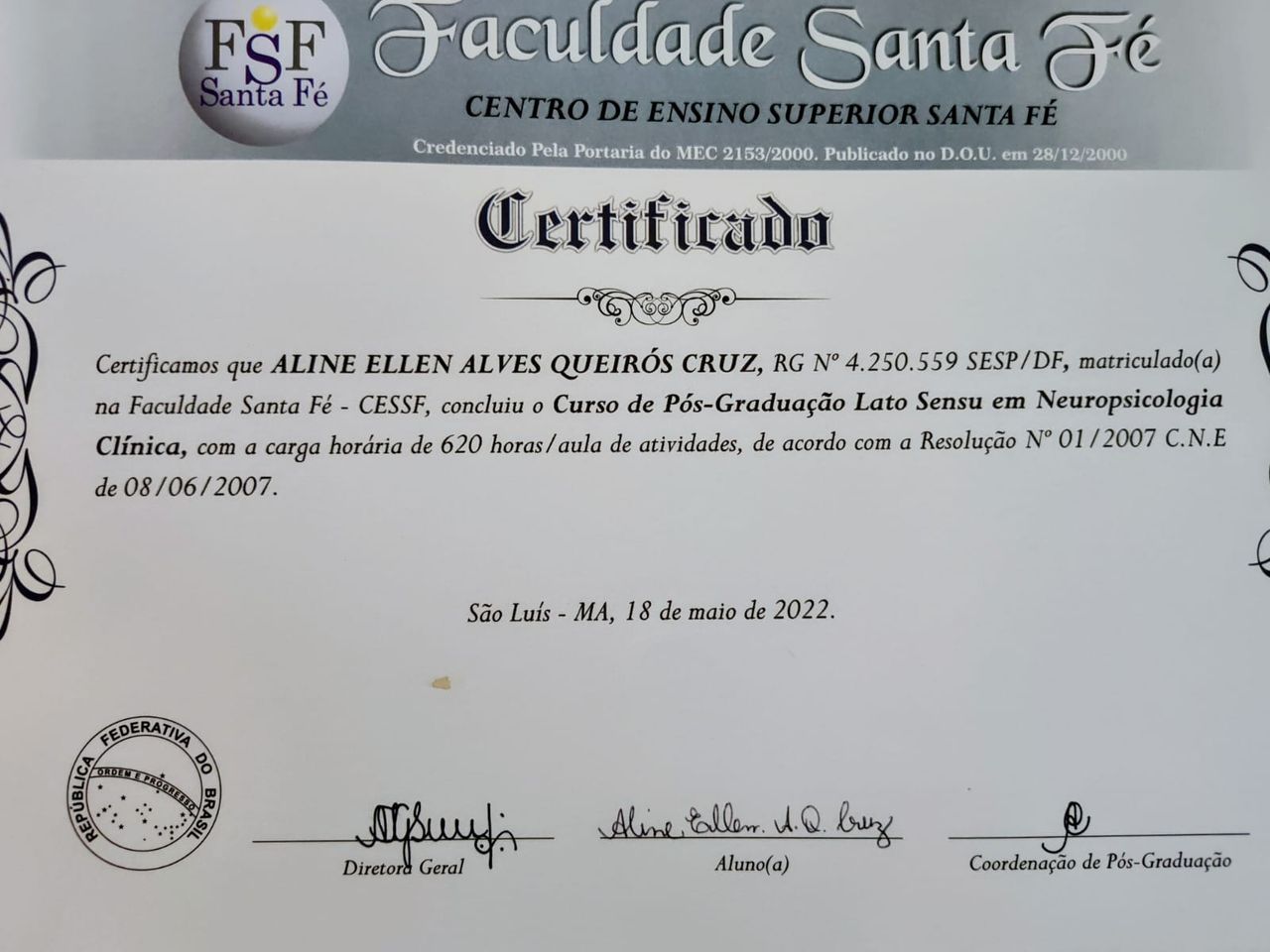 Gostaria de recomendar o excelente trabalho da Dra. Aline. Ela realizou uma avaliação neuropsicológica completa e muito criteriosa. Ao longo de 12 sessões, demonstrou um preparo técnico impecável e muita paciência para investigar cada detalhe. O processo foi conduzido com seriedade e ética, resultando em um diagnóstico seguro que nos trouxe muita clareza. Uma profissional de confiança.