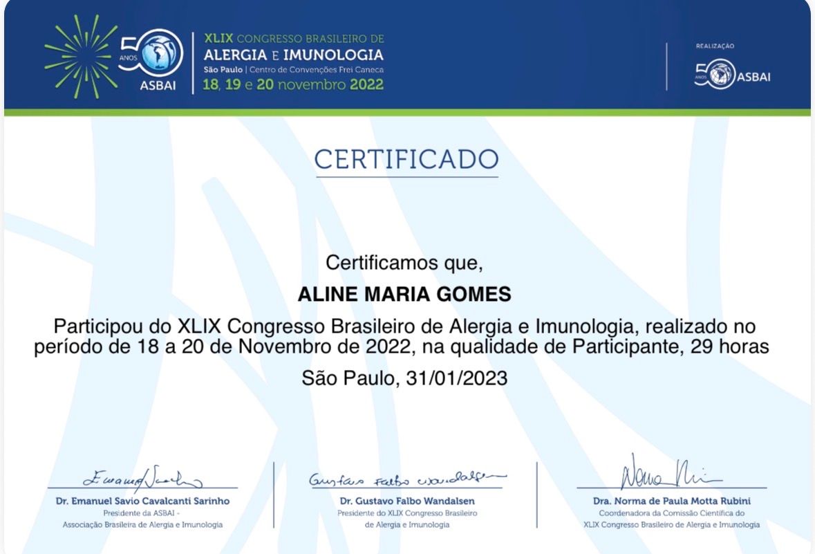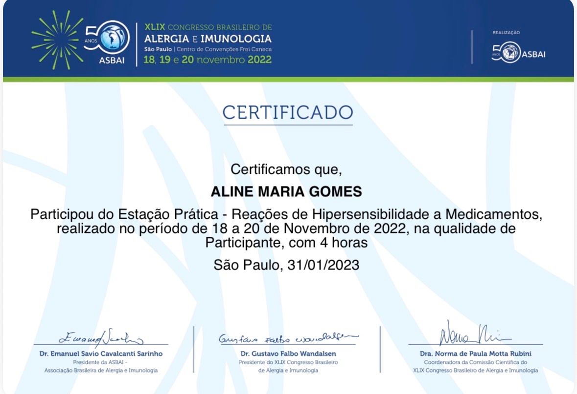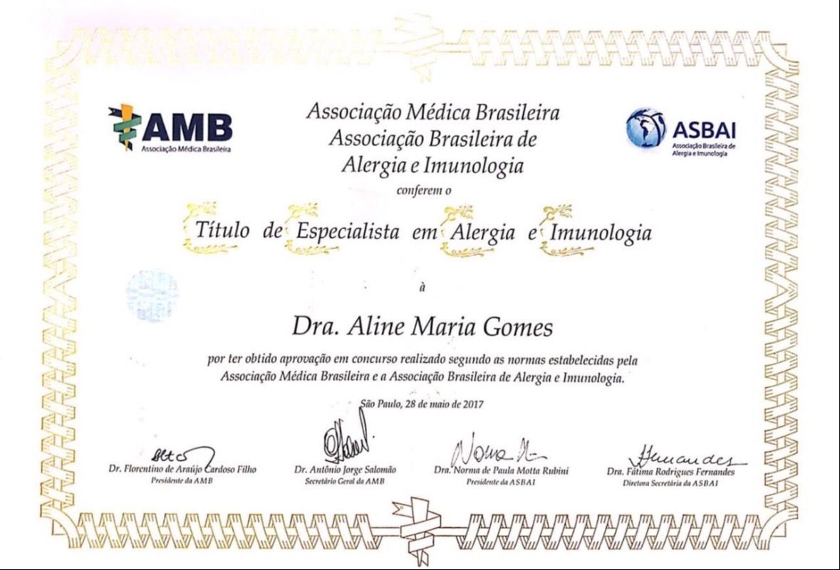 Quais são as principais especialidades de Aline Maria Gomes?Aline Maria Gomes é alergista. Te mostramos alguns dos serviços oferecidos pelo especialista graças à sua trajetória e vasta experiência: Primeira consulta Alergia e Imunologia, Consulta médica, Consulta de Alergia e Imunologia (adultos e crianças), Retorno de consultas Alergia e Imunologia.