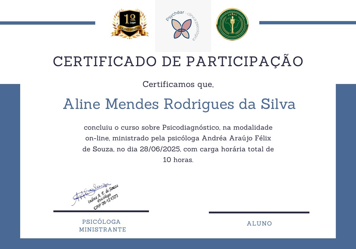 Quais são as principais especialidades de Aline Mendes Rodrigues da Silva ?Aline Mendes Rodrigues da Silva é psicóloga. Te mostramos alguns dos serviços oferecidos pelo especialista graças à sua trajetória e vasta experiência: Primeira consulta psicologia, Teleconsulta.