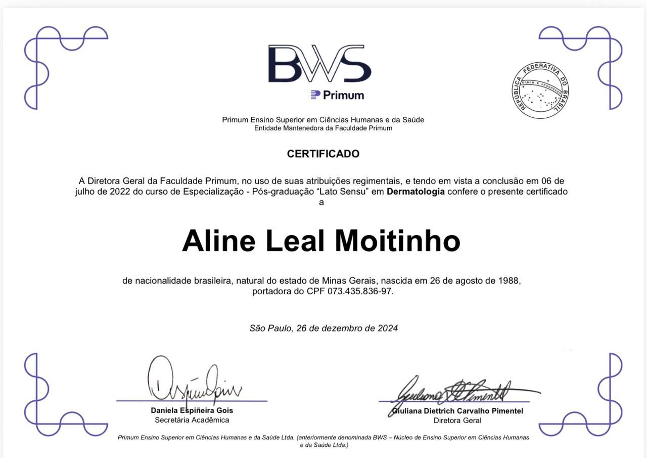 Quais são as principais especialidades de Aline Moitinho?Aline Moitinho é dermatologista. Te mostramos alguns dos serviços oferecidos pelo especialista graças à sua trajetória e vasta experiência: Consulta Dermatologia, Consulta convênio, Detecção precoce do câncer de pele, Tratamento para alopecia (queda de cabelos), Dermatologia pediátrica, Remoção de manchas, Tratamento de rugas, Tratamento de acne/rosácea, Tratamento de cicatrizes de acne, Laser para cicatrizes de acne.