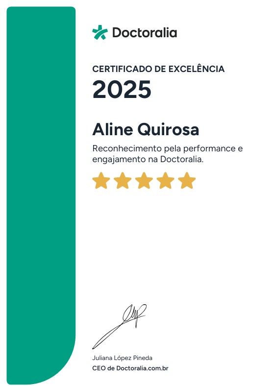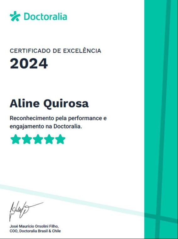 Posso passar por atendimento online com Aline Quirosa, sem ter que ir até o consultório?Sim, Aline Quirosa oferece atendimento online. Basta selecionar "Teleconsulta" ao agendar sua consulta e você poderá ver as datas e horários disponíveis.