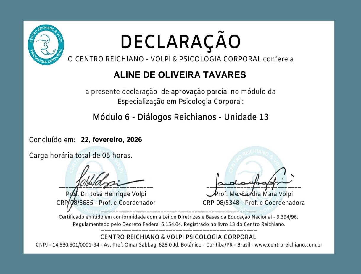 Psicóloga, Psicanalista, Supervisora Clínica, atualmente me especializando em Psicologia Corporal pelo Centro Reichiano de Curitiba/PR, também em Avaliação Psicológica e Psicodiagnóstico. Focada no trabalho clínico, acolhendo adolescentes e adultos, on-line em qualquer lugar do mundo, presencialmente na cidade de Pelotas/RS.