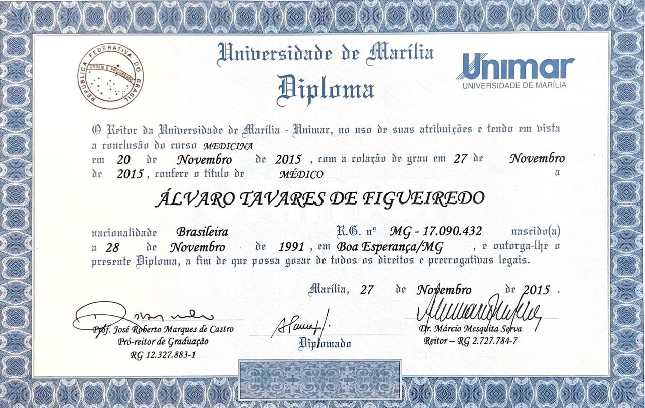 Como posso marcar uma consulta com Álvaro Tavares de Figueiredo?O calendário que Álvaro Tavares de Figueiredo exibe em seu perfil na Doctoralia é atualizado em tempo real. Tudo o que precisa é escolher o dia e a hora que forem mais convenientes para você. O agendamento é gratuito e você também recebe um lembrete antes da consulta.