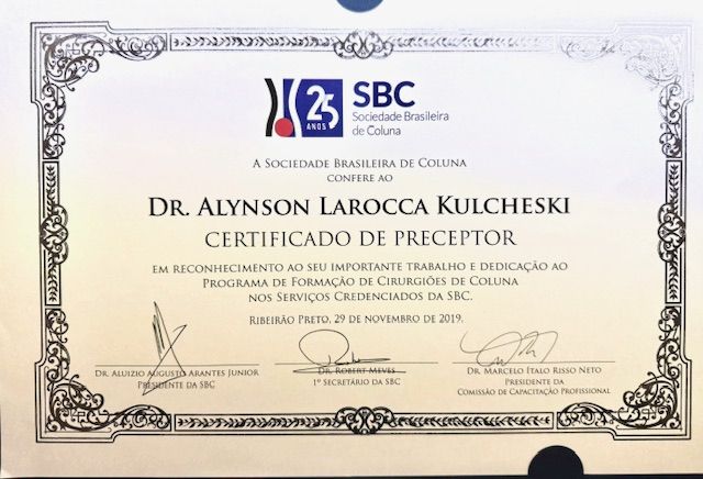 Médico, Mestre e Doutor em Cirurgia. Formou-se Ortopedista e Traumatologista, especializado em Cirurgia da Coluna Vertebral. Cursou a Faculdade de Medicina na Universidade Federal do Paraná (UFPR) e realizou sua formação na especialidade de Ortopedia e Traumatologia no Hospital de Clinicas (HC-UFPR) e no Hospital do Trabalhador da Universidade Federal do Paraná. Especializou-se na Cirurgia da Coluna Vertebral pela Universidade Federal do Paraná, sob orientação do seu Mestre Dr. Xavier Soler i Graells, com quem trabalha desde então. Realizou aperfeiçoamentos na prática da Cirurgia da Coluna em Hospitais de renome nacional e internacional, como: 1) Instituto Rothman da Universidade Thomas Jefferson na Filadelfia -EUA; 2) Hospital da AACD (Associação de Assistência à Criança Deficiente) na cidade de São Paulo e na Unicamp (Universidade de Campinas), em Campinas-SP; 3) Hospital St. Anna, onde se aperfeiçoou em cirurgias por vídeo (Endoscopias/cirurgias Endoscópicas) da Coluna Vertebral , nas cidades de Dusseldorf e Herne na Alemanha. Realiza treinamentos frequentes em Cirurgias Minimamente Invasivas da Coluna Vertebral nas cidades de Miami, Palm Beach, Dallas, New Jersey e Filadelfia nos EUA, onde atuou como professor de cursos para outros médicos cirurgiões. Possui título de Especialista em Ensino Médico: título este conferido pela Universidade Federal do Paraná. Possui Mestrado e Doutorado em Cirurgia: título conferido pela Universidade Federal do Paraná. Consultor de Cirurgias Minimamente Invasivas da Coluna Vertebral e Endoscopias da Coluna. É membro efetivo e atuante das Sociedades médicas: a) Sociedade Brasileira de Ortopedia e Traumatologia (SBOT); b)Sociedade Brasileira de Coluna(SBC); c) Sociedade Brasileira de Coluna Minimamente Invasiva – SBC.MISS. É preceptor da Residência médica de Ortopedia e Traumatologia do Hospital do Trabalhador, em Curitiba- Brasil. É preceptor da Especialização em Cirurgia da Coluna Vertebral do Hospital de Clínicas/UFPR e Hospital do Trabalhador, em Curitiba- Brasil. Professor da Disciplina de Ortopedia da Universidade Federal do Paraná (UFPR). Professor de Cursos de Cirurgia de Coluna nos EUA, na América Latina e no Brasil. Professor e Organizador dos Cursos de Imersão em Endoscopia da Coluna do Instituto Scolla, localizado em Curitba-PR/ Brasil. Membro da equipe de Cirurgia de Coluna Vertebral do Hospital de Clínicas da Universidade Federal do Paraná e do Hospital do Trabalhador. Membro da diretoria da SBOT-PR e da CET (Comissão de Ensino e Treinamento). Coordenador da CIrurgia da Coluna da OrtoPro Curitiba. Realiza cirurgias da Coluna Vertebral na cidade de Curitiba- Brasil, nos Hospitais: VITA Curitiba; VITA Batel, Hospital Santa Cruz e Hospital Pilar. Realiza consultorias de cirurgia e treinamento para outros médicos em todo o Brasil, América Latina e EUA.