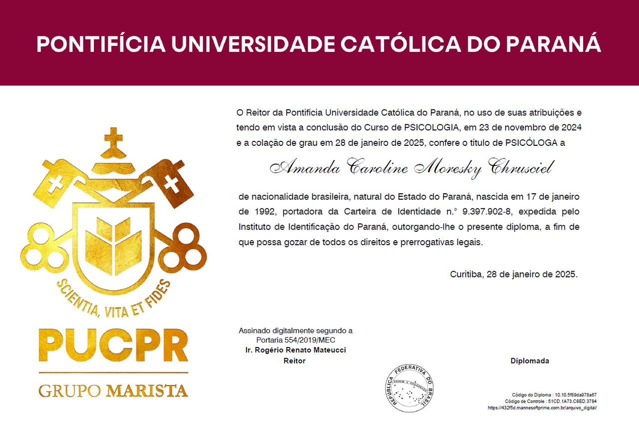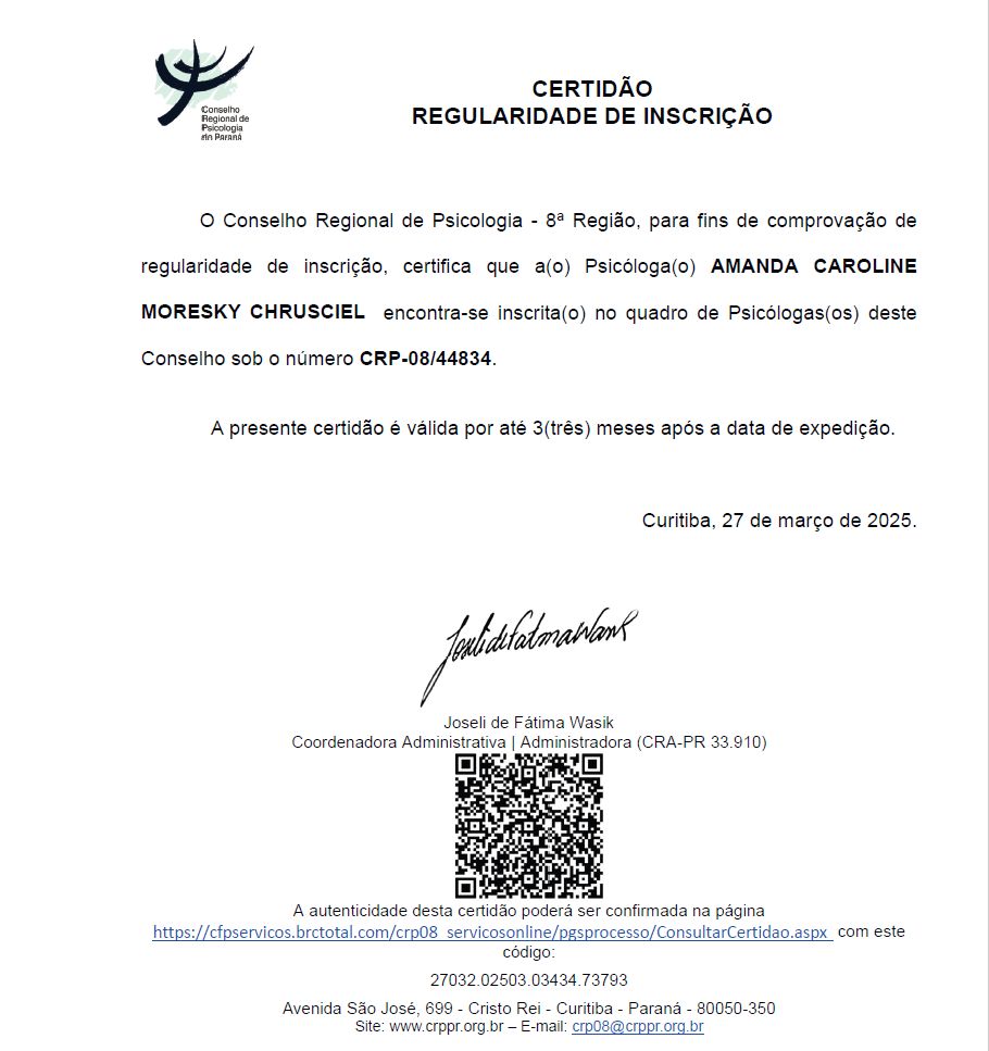 Quais são as principais especialidades de Amanda Caroline Moresky Chrusciel?Amanda Caroline Moresky Chrusciel é psicóloga. Te mostramos alguns dos serviços oferecidos pelo especialista graças à sua trajetória e vasta experiência: Consulta psicológica do adolescente, Consulta psicológica do adulto, Consulta psicológica do idoso, Consulta Psicologia, Orientação profissional e carreira, Teleconsulta, Psicoterapia, Consulta psicologia online.