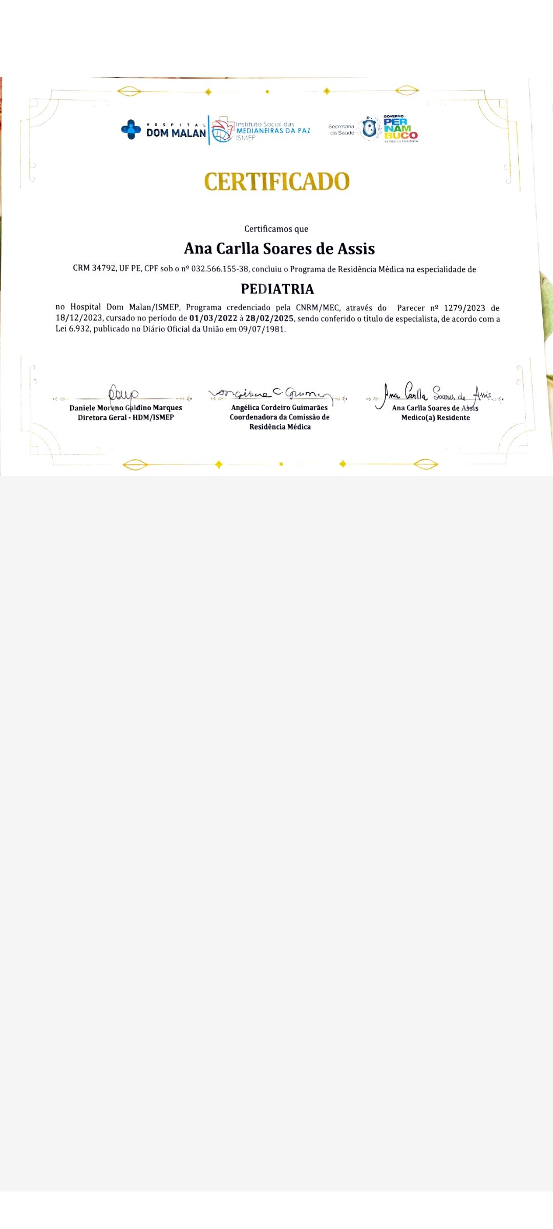 Filha única de Ana Cláudia e Marcos, apaixonada por artesanato, livros, pela natureza e pelos animais! Formada em medicina no ano de 2021, em Vitória da Conquista. Além disso, possuo 03 anos de residência médica em pediatria - a especialização - no Hospital Martagão Gesteira e Hospital Dom Malan, em Petrolina-PE.