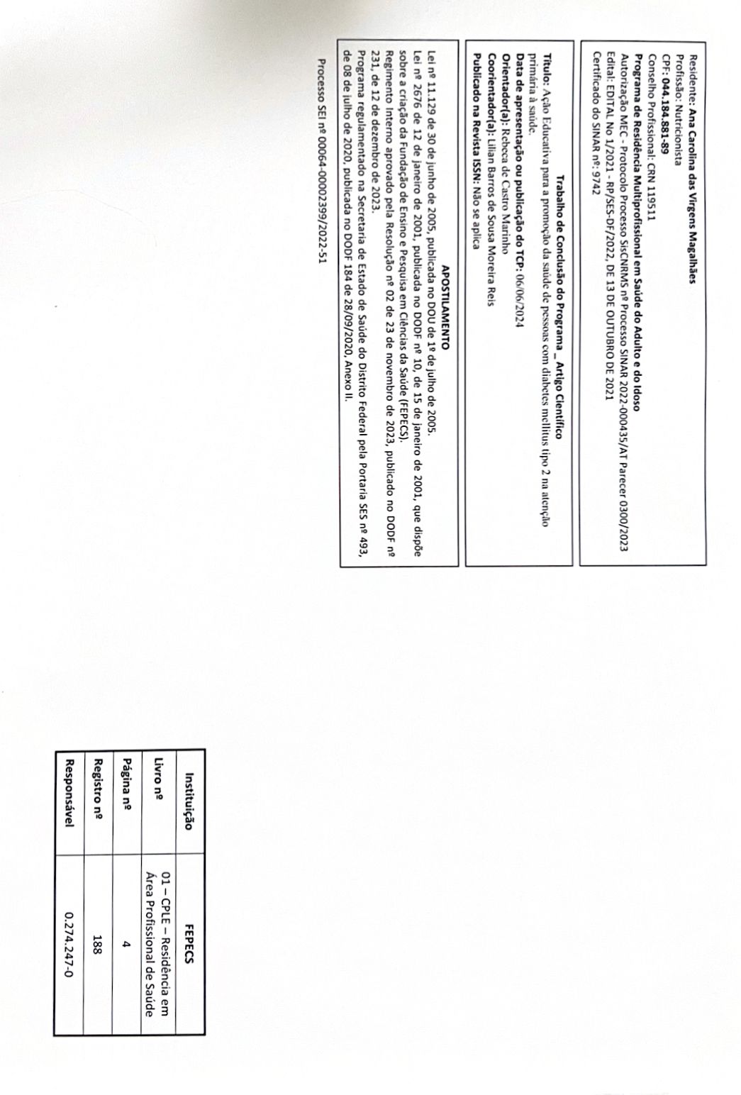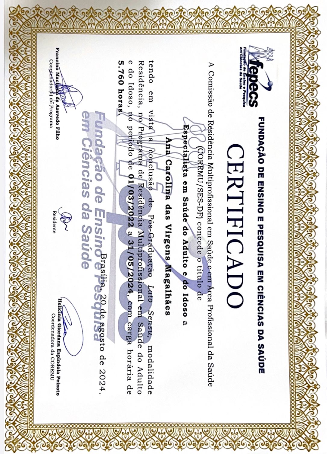 Especialista em saúde do adulto e idoso - Residência multiprofissional pela ESCS-DF.