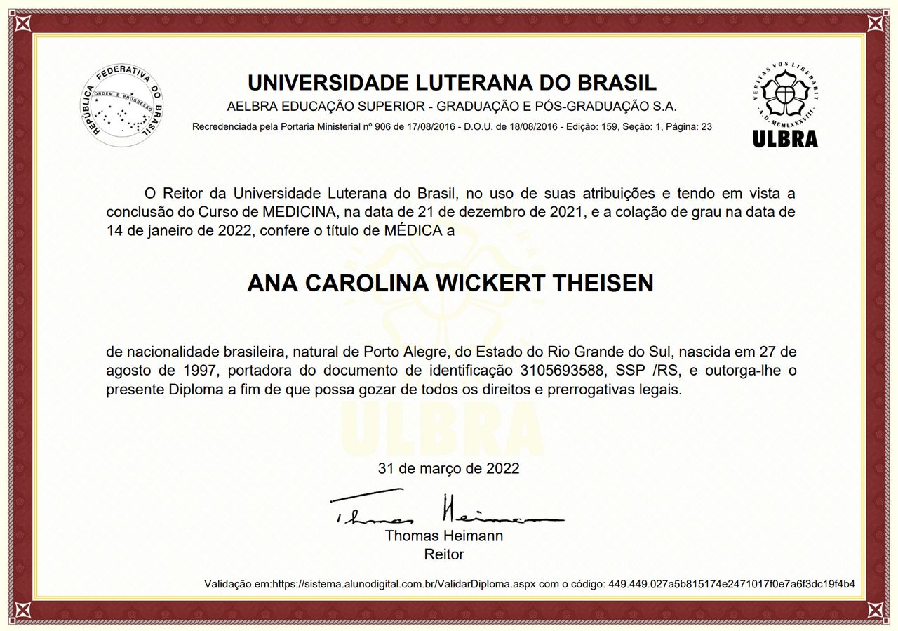 Quais são as principais especialidades de Ana Carolina Wickert Theisen?Ana Carolina Wickert Theisen é ginecologista. Te mostramos alguns dos serviços oferecidos pelo especialista graças à sua trajetória e vasta experiência: Primeira consulta ginecologia e obstetrícia, Acompanhamento com endocrinologista no pós-operatório de cirurgia bariátrica, Acompanhamento de ciclo menstrual e fertilidade, Acompanhamento de Doença celíaca e investigação familiar, Acompanhamento de gravidez gemelar, Acompanhamento de nódulos tireoidianos, Acompanhamento de pacientes com doenças na tireoide, Acompanhamento de pacientes com hipertensão e colesterol, Acompanhamento de pacientes com Osteoporose, Acompanhamento de pacientes diabéticos.