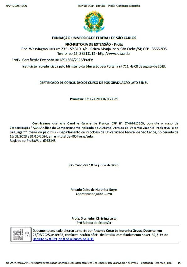 Ana Caroline Barone de França tem formação em Psicologia pelo Centro Universitário das Américas (FAM). Especialista em Analise do Comportamento Aplicada pela Universidade Federal de São Carlos (UFSCAR), com vasta experiência em intervenções em ABA aplicadas ao autismo, atraso no desenvolvimento, deficiência intelectual e, entre outras dificuldades pontuais de cada indivíduo (como aplicadora e coordenadora).