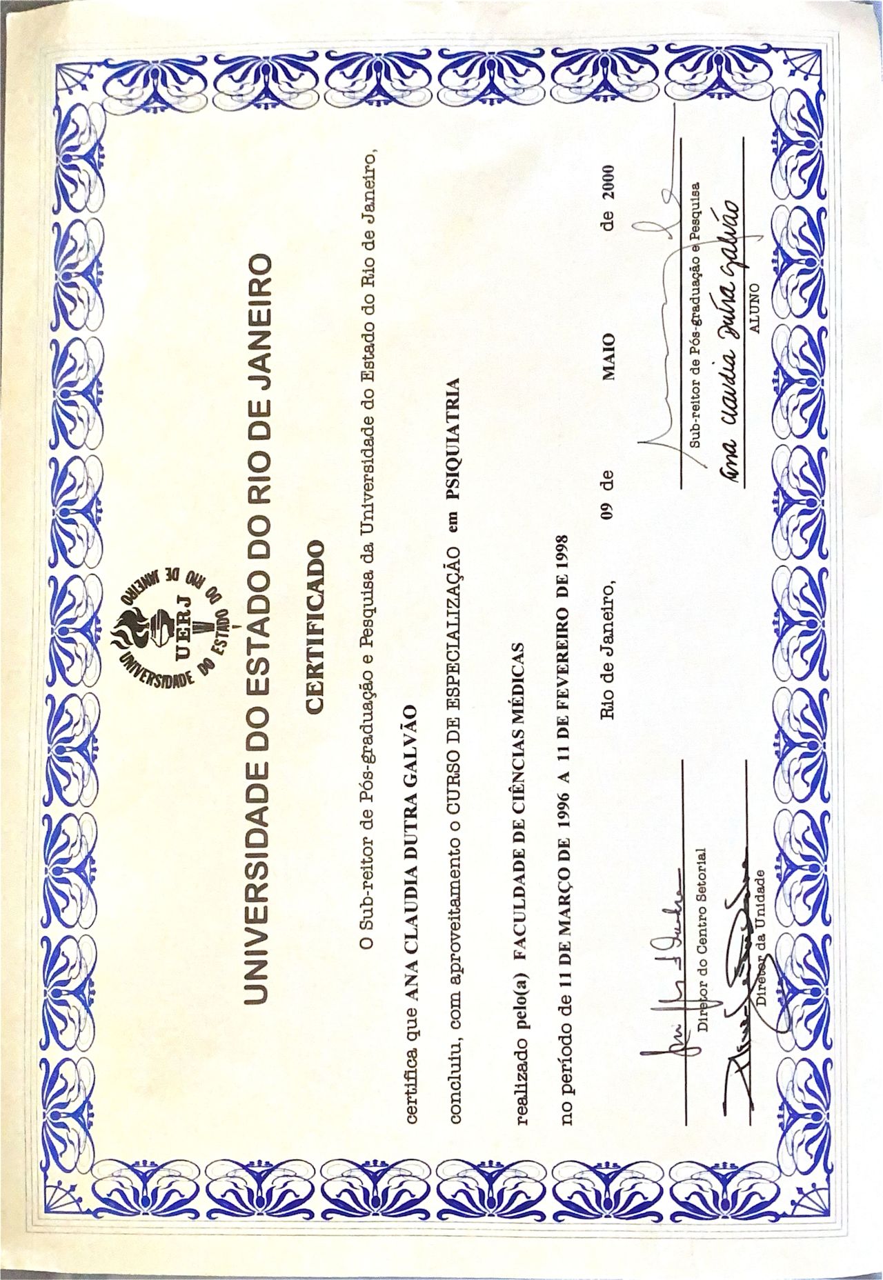 Medica formada pela Universidade Gama Filho, com especialização em Psiquiatria pela Universidade Estadual do Rio de Janeiro. Pós Graduanda em Psiquiatria pelo Instituto Einstein (Centro de Educação em Saúde Abram Szajman)