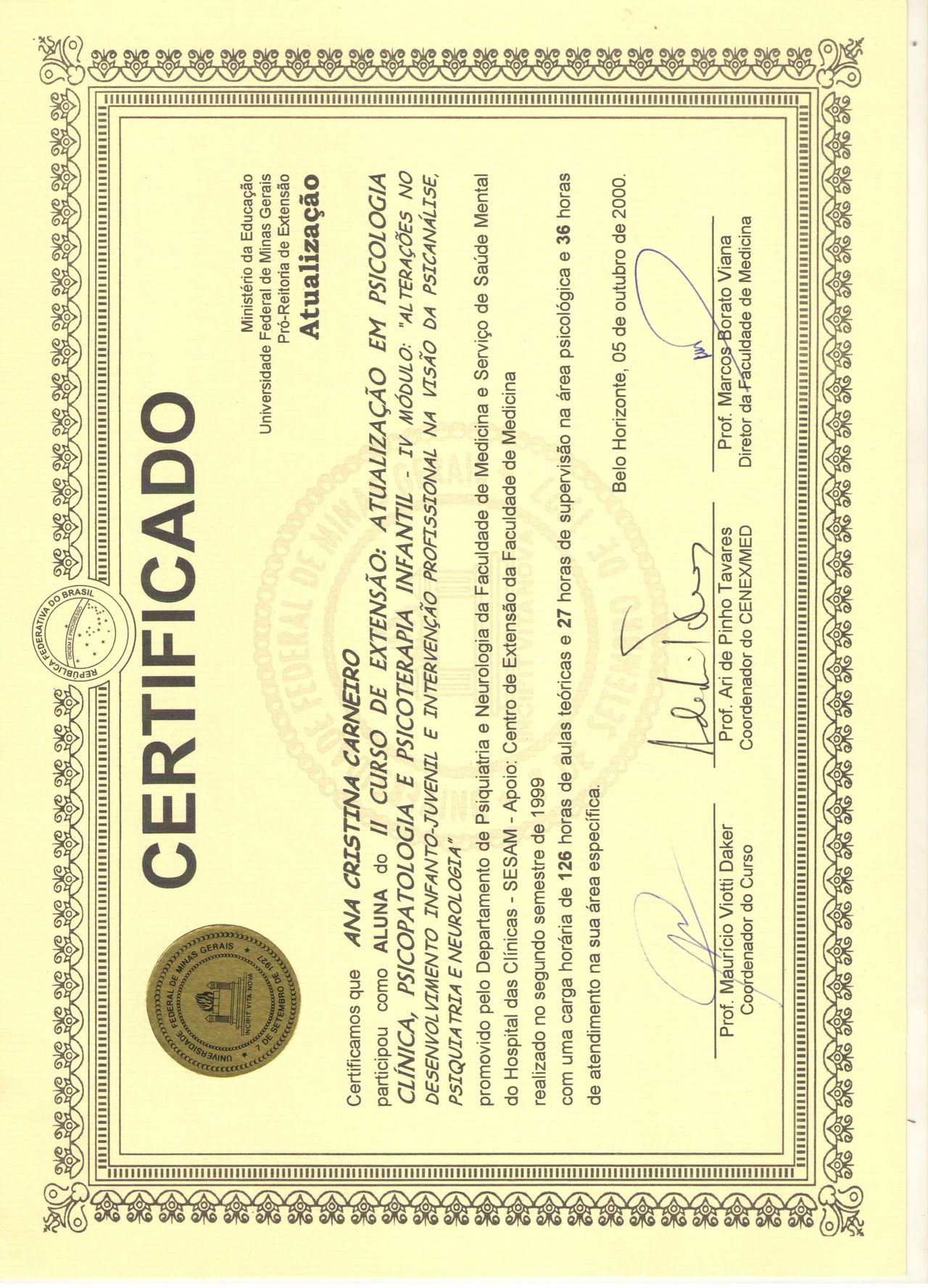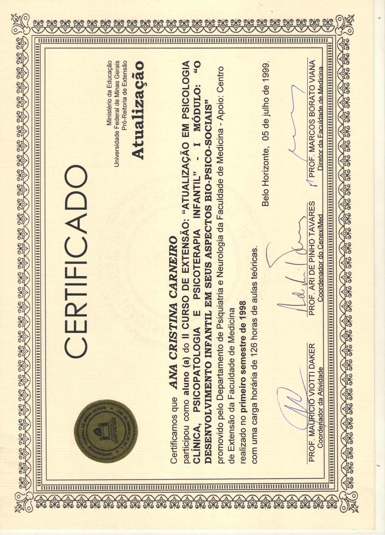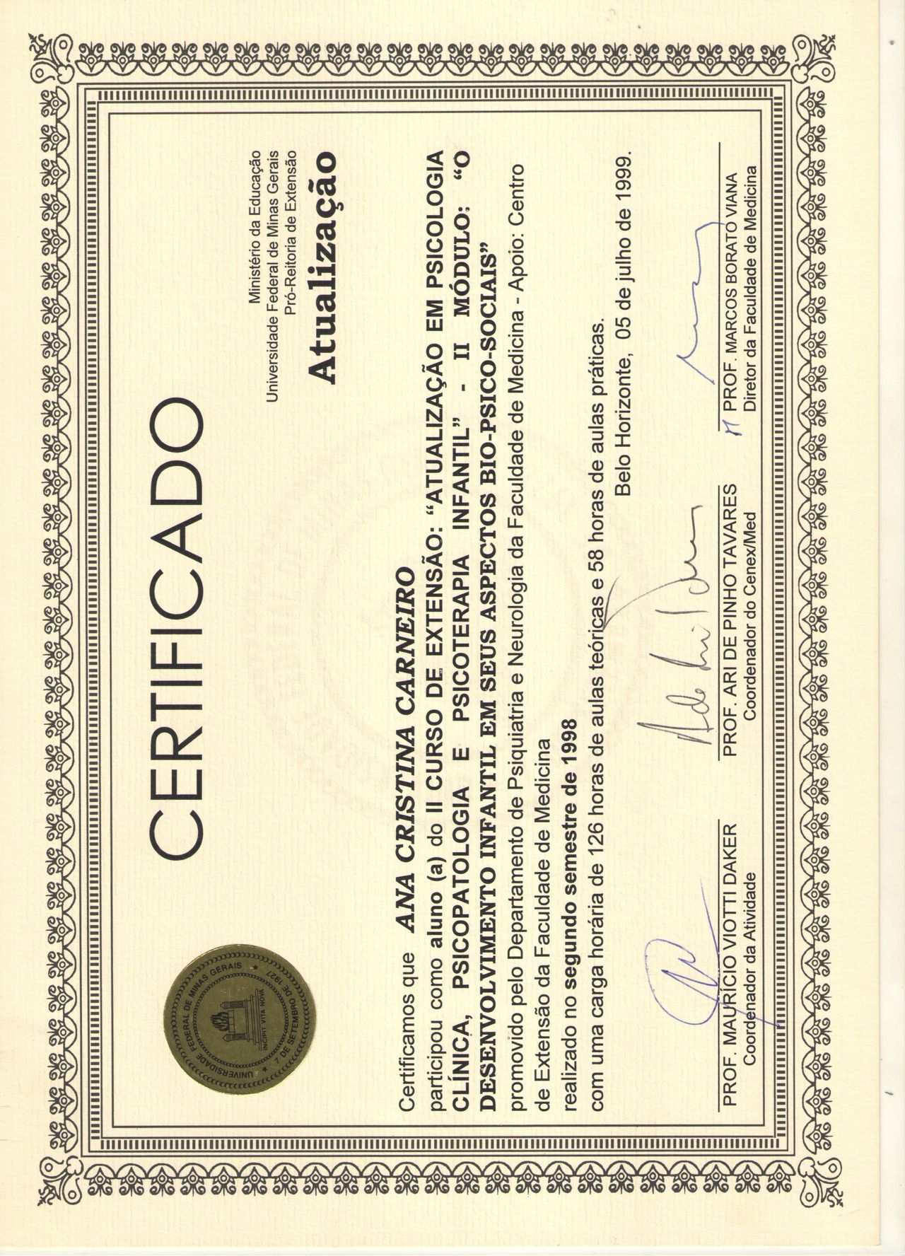 Atualização em Psicologia Clinica, Psicopatologia e Psicoterapia Infantil pela UFMG.