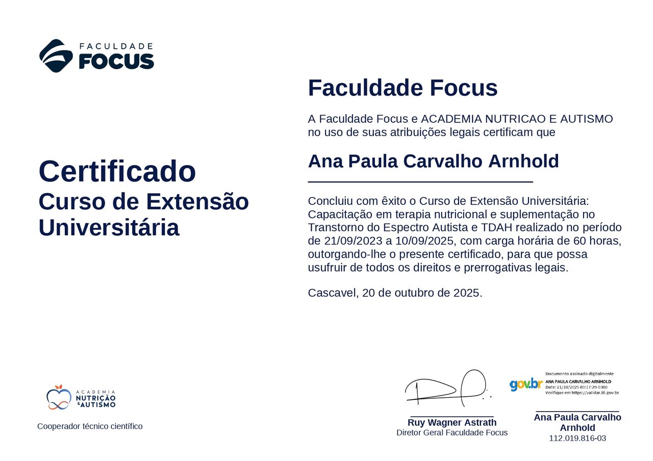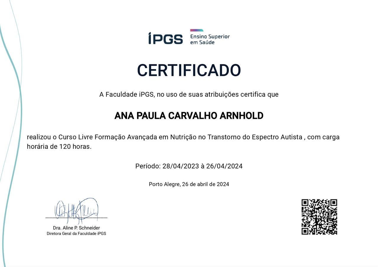 Experiência de atuação no manejo nutricional de crianças em tratamento de patologias de média e alta complexidade. Possui formação avançada em Nutrição no Transtorno do Espectro Autista e Capacitação em Terapia Nutricional e Suplementação no Transtorno do Espectro Autista.