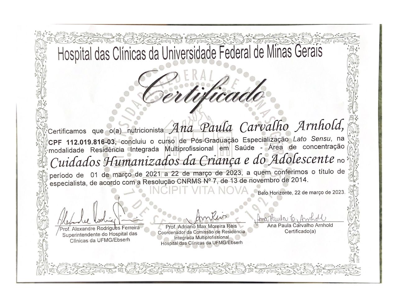 Atuação: Recém-nascidos, bebês, crianças e adolescentes até 16 anos. Prematuridade; Bebês PIG; Introdução alimentar; Alergias e intolerâncias alimentares; Seletividade alimentar; Baixo ganho de peso; Sobrepeso e obesidade; Alterações bioquímicas (Colesterol, triglicérides, glicemia, deficiência de vitaminas e minerais); Transtornos do Neurodesenvolvimento (Autismo e TDAH); Síndrome de Down. Acompanhamento nutricional de crianças em tratamento de doenças de média e alta complexidade como tratamento oncohematológico, doenças pulmonares, cardiopatias, neuropatias, nefropatias, pacientes em terapia nutricional enteral.