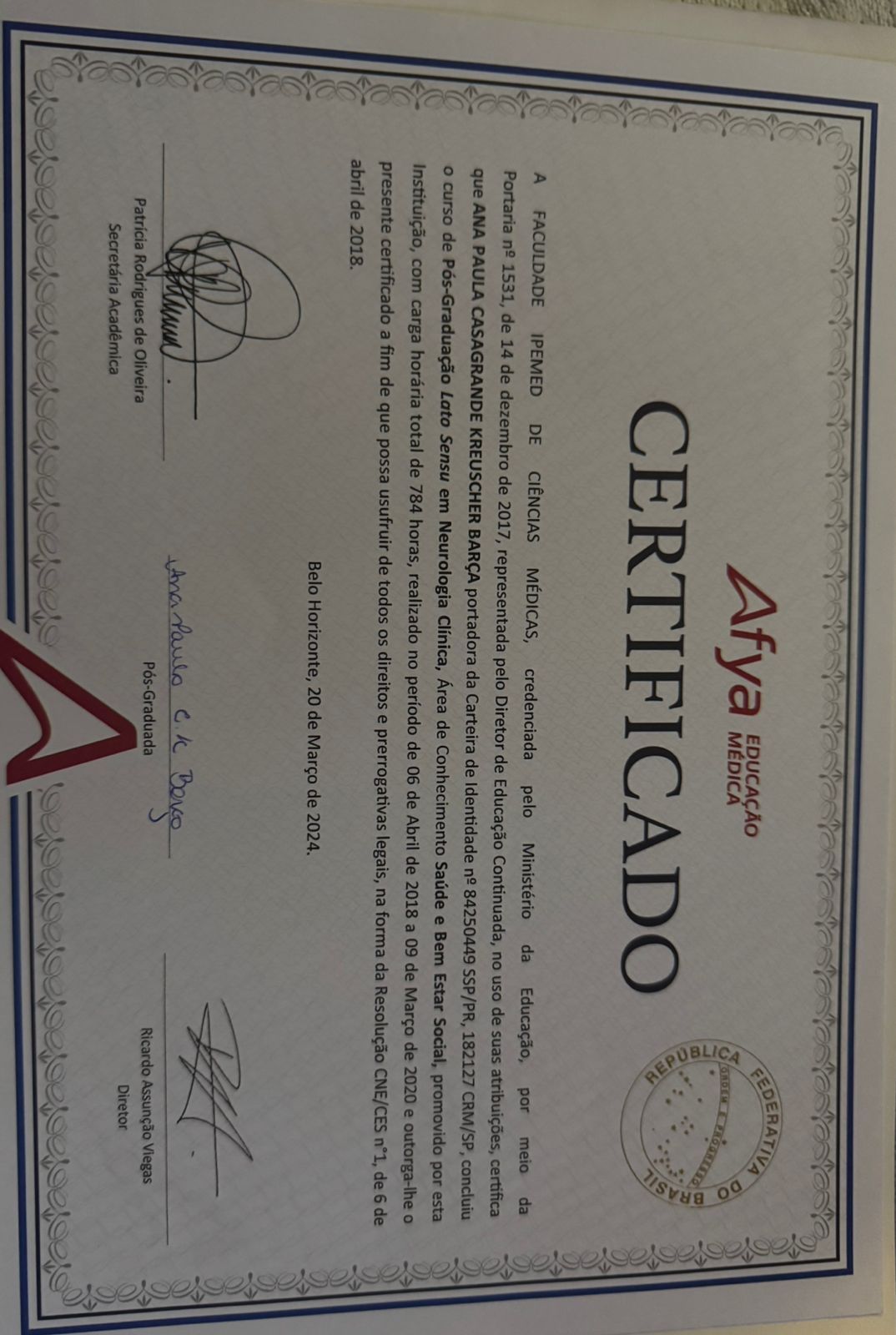 Quais são as principais especialidades de Ana Paula Casagrande Kreuscher Barça?Ana Paula Casagrande Kreuscher Barça é neurologista. Te mostramos alguns dos serviços oferecidos pelo especialista graças à sua trajetória e vasta experiência: Consulta neurologia, Consulta médica, Consulta telemedicina, Consulta Neurologista, Teleconsulta.