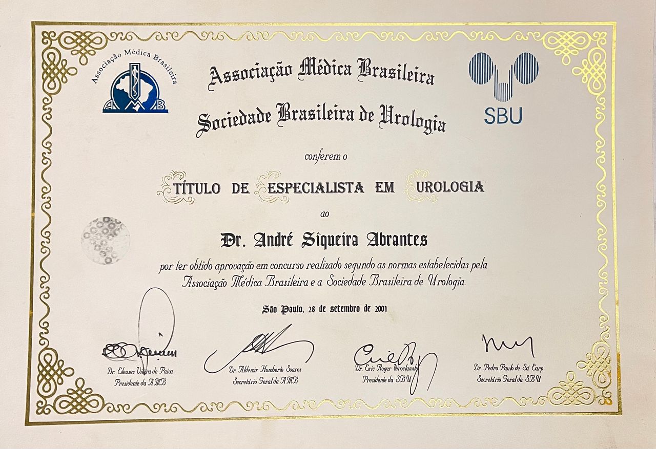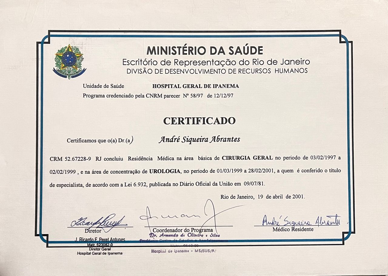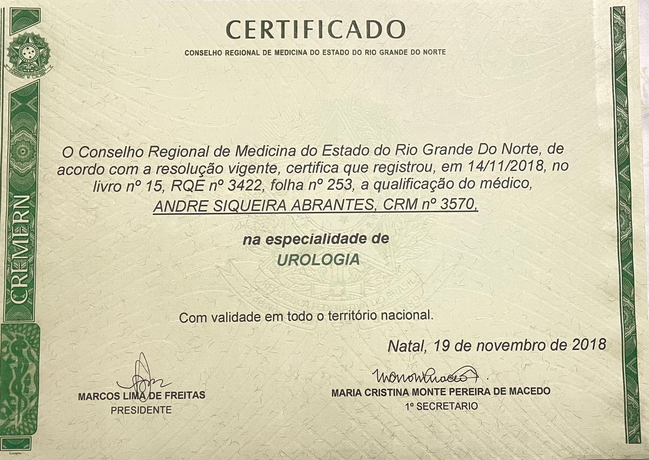 Quais são as principais especialidades de André Siqueira Abrantes?André Siqueira Abrantes é urologista. Te mostramos alguns dos serviços oferecidos pelo especialista graças à sua trajetória e vasta experiência: Litotripsia, Prostatectomia Por Cancer, Tratamento Cirurgico Da Incontinencia Urinaria Por Via Vaginal, Nefrectomia Total, Prótese peniana, Nefrectomia parcial, Ressecção Endoscopica Da Prostata, Tratamento Cirurgico Da Varicocele, Tratamento Cirurgico da Hidrocele, Check up.