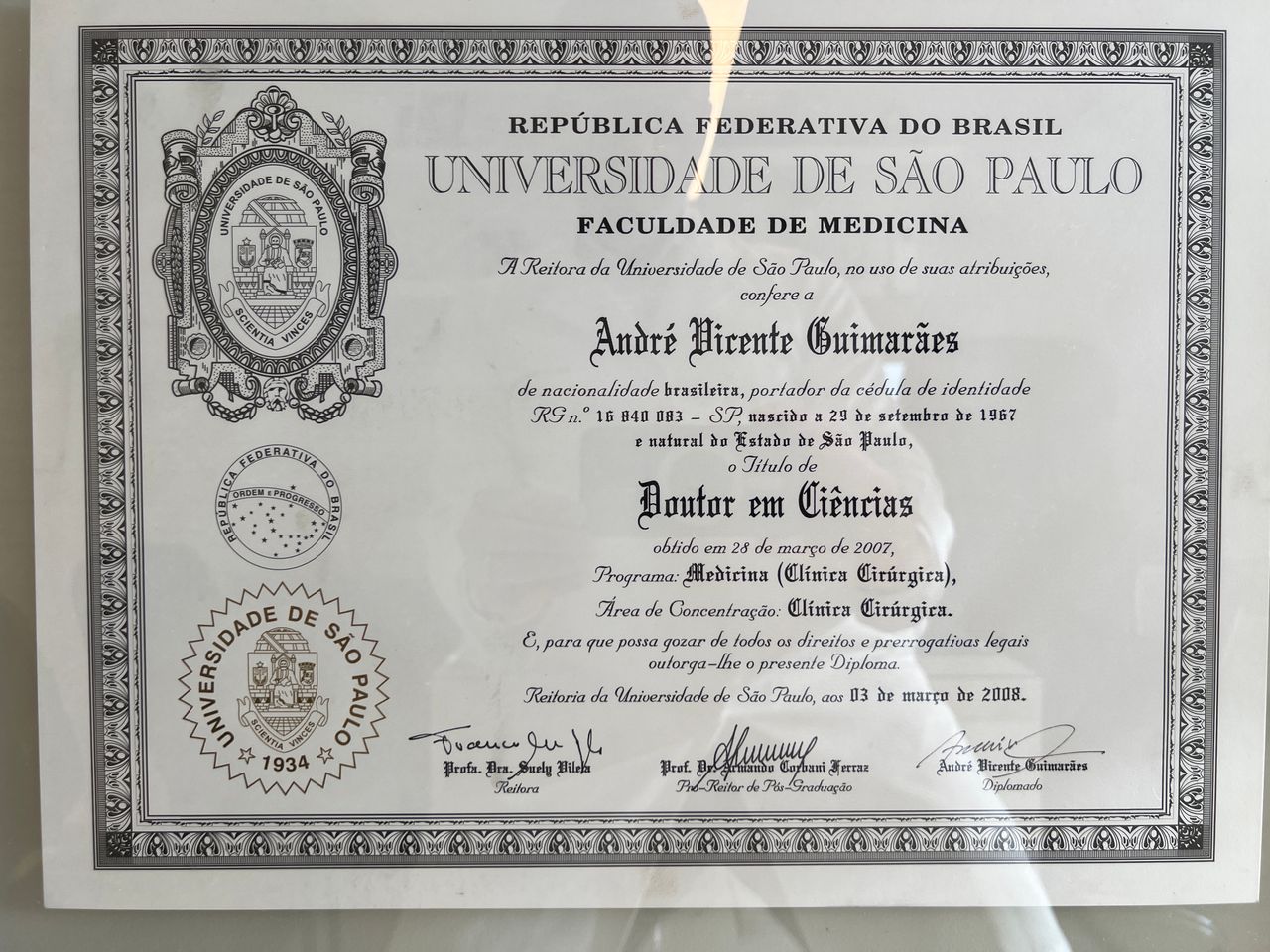 45 opiniõesEu sou André Vicente Guimarães, médico, brasileiro, casado, nascido em Santos (SP) em 29 de setembro de 1967, inscrito no CRM-SP 72233.