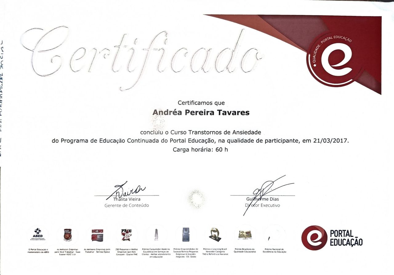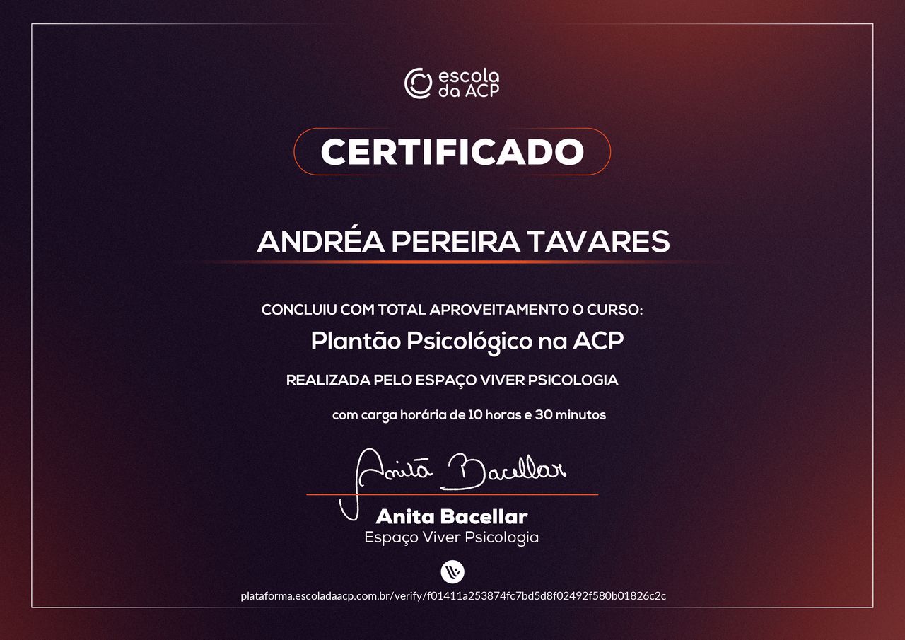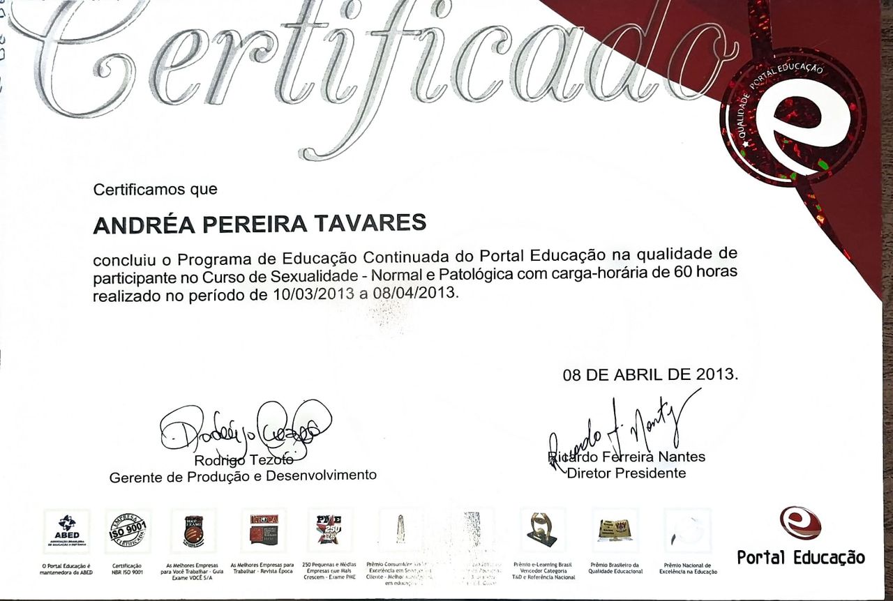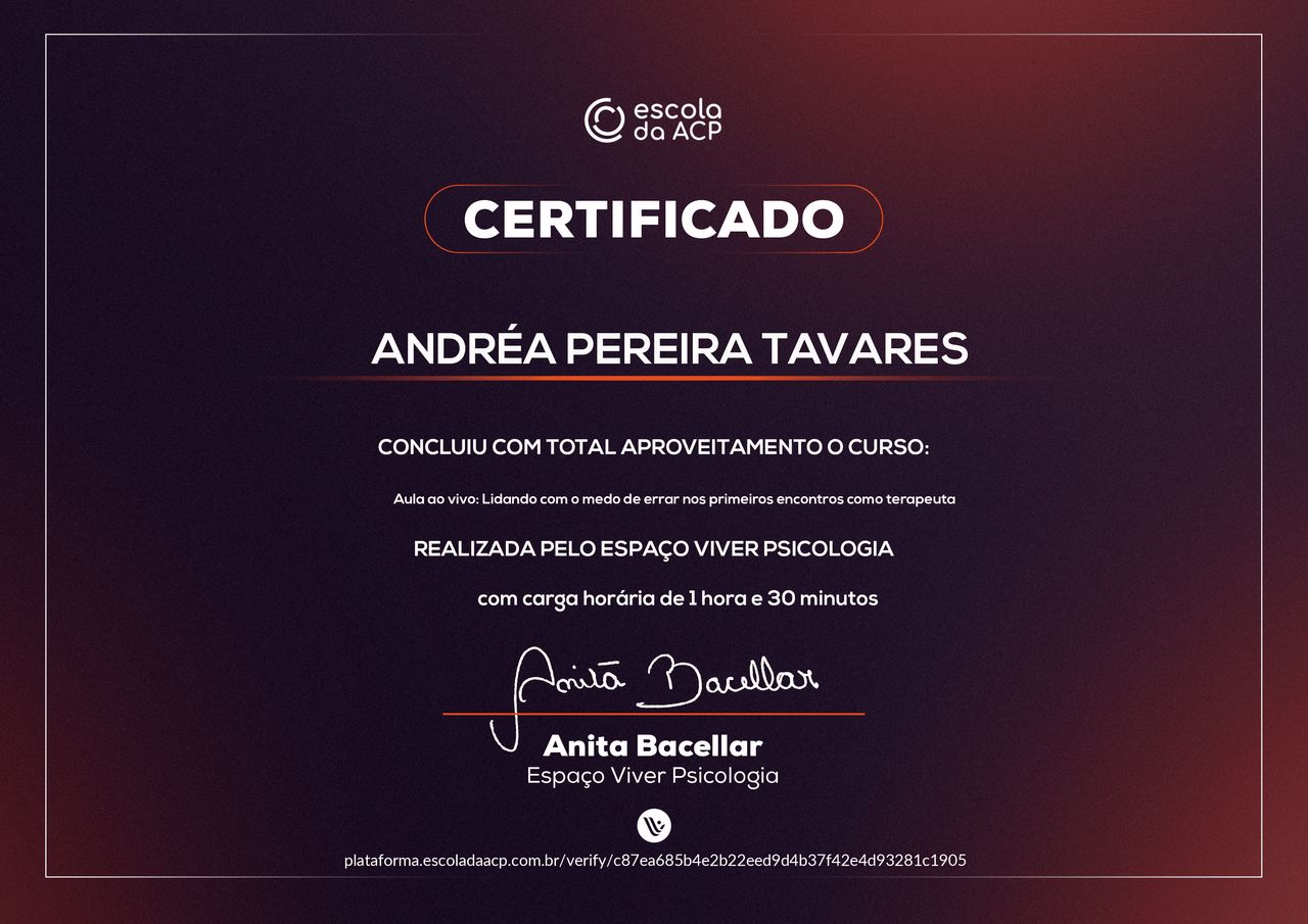 Quais são as principais especialidades de Andréa Tavares?Andréa Tavares é psicóloga. Te mostramos alguns dos serviços oferecidos pelo especialista graças à sua trajetória e vasta experiência: Teleconsulta, Atendimento psicológico online, Atendimento Online em Psicoterapia, Terapia online, Atendimento Psicológico online para adulto, Terapia de Casal Online, Psicoterapia online.