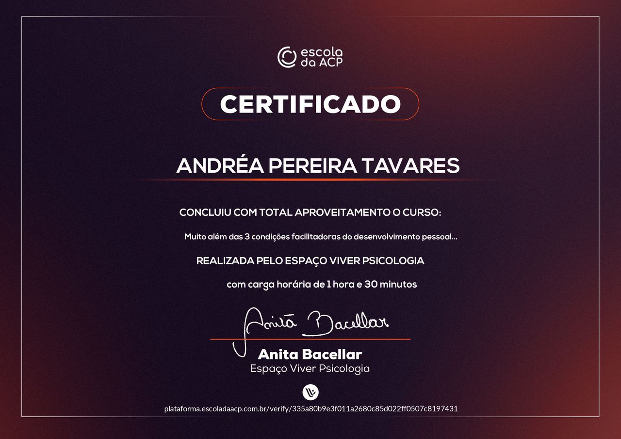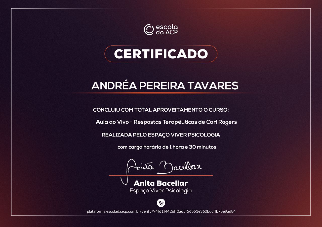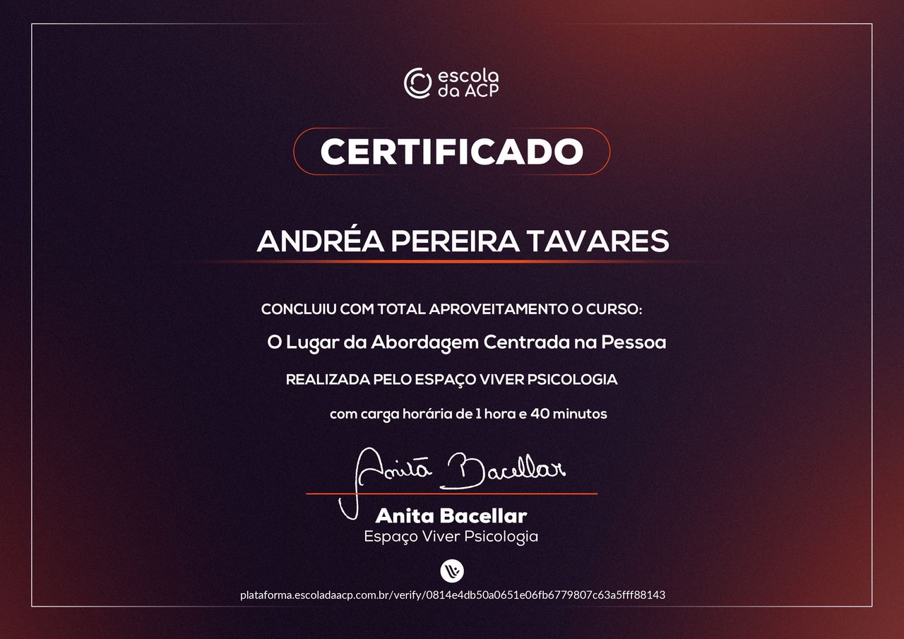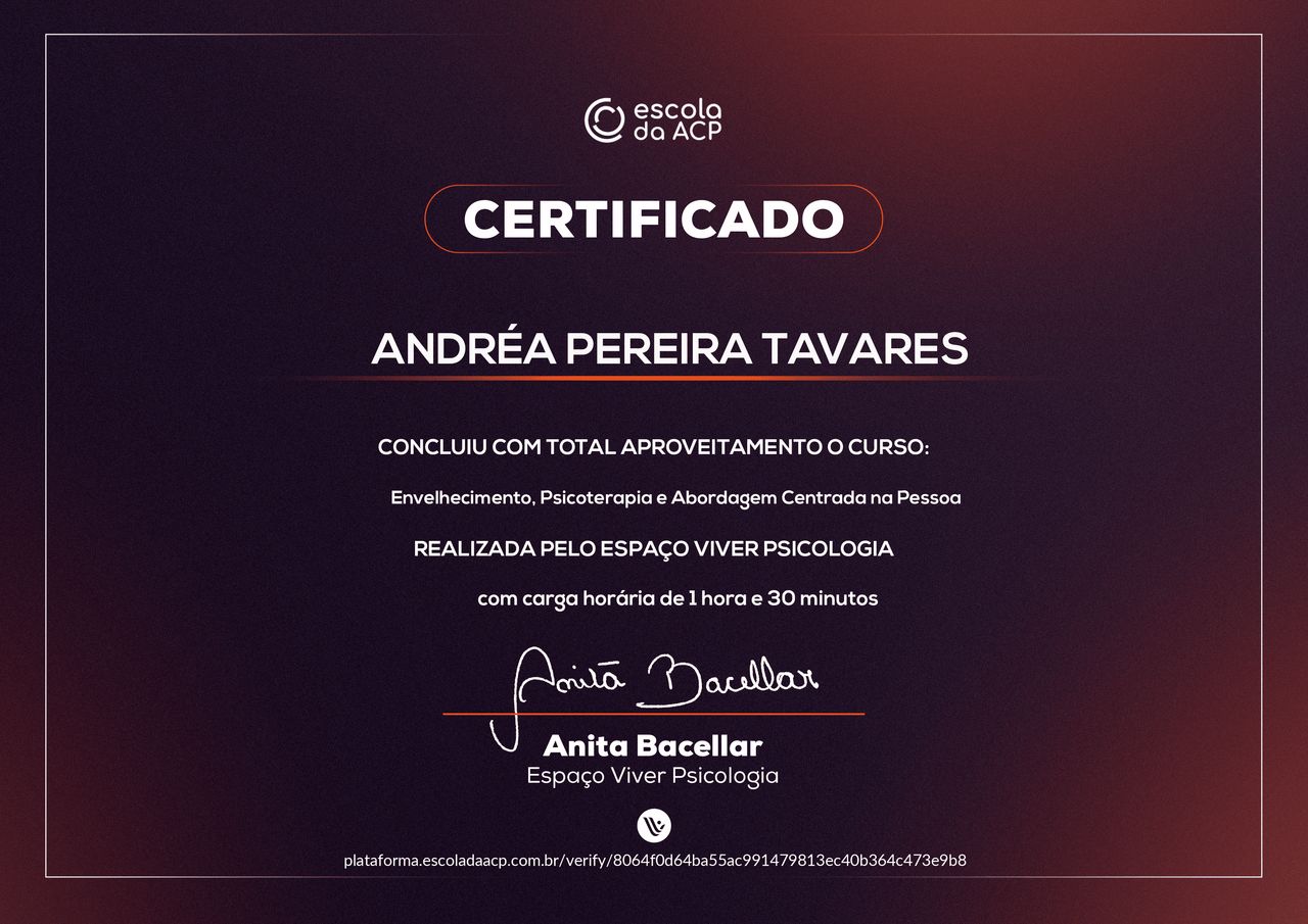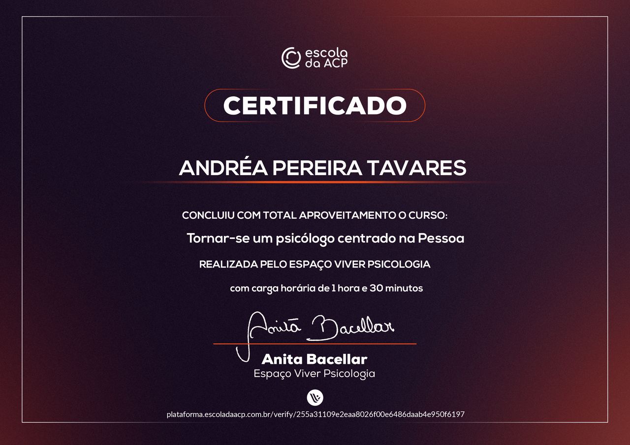 A minha meta de trabalho é sempre buscar o melhor que existe no ser humano, com acolhimento empático, aceitação positiva incondicional e autenticidade na relação terapêutica. Acredito no desenvolvimento e crescimento humano.