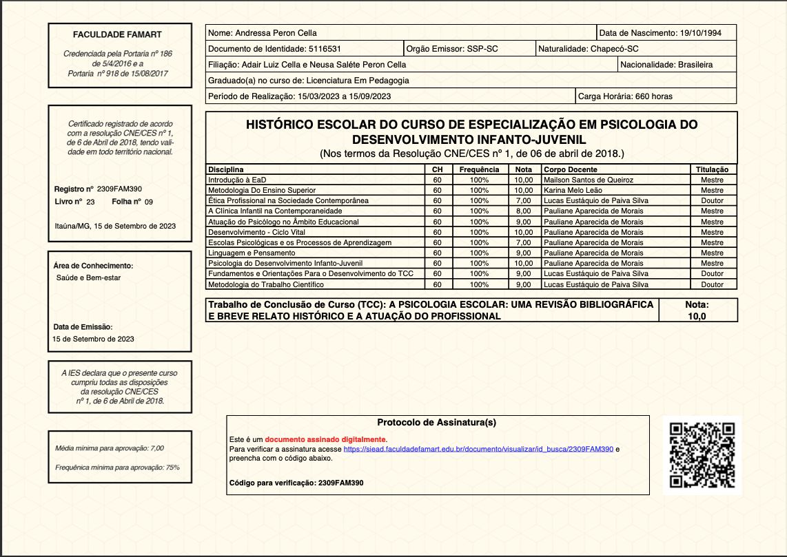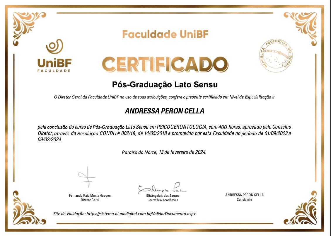 Quais são as principais especialidades de Andressa Peron Cella?Andressa Peron Cella é psicóloga. Te mostramos alguns dos serviços oferecidos pelo especialista graças à sua trajetória e vasta experiência: Teleconsulta, Acompanhamento a pacientes com: ansiedade,depressão, fobias e traumas psicológicos, Acolhimento psicológico breve, Acompanhamento de pacientes adultos, Acompanhamento de transtorno de TDAH, Acompanhamento em disforia de gênero, Acompanhamento na gestação, Acompanhamento para bem estar psicológico, Acompanhamento para envelhecimento saudável, Abertura Da Estenose Aortica Valvar.