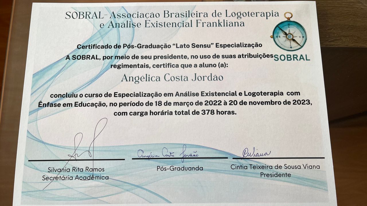 Eu sou Angélica Jordão, terapeuta especialista em Logoterapia e Análise Existencial pela SOBRAL - Associação Brasileira de Logoterapia e Análise Existencial Frankliana.