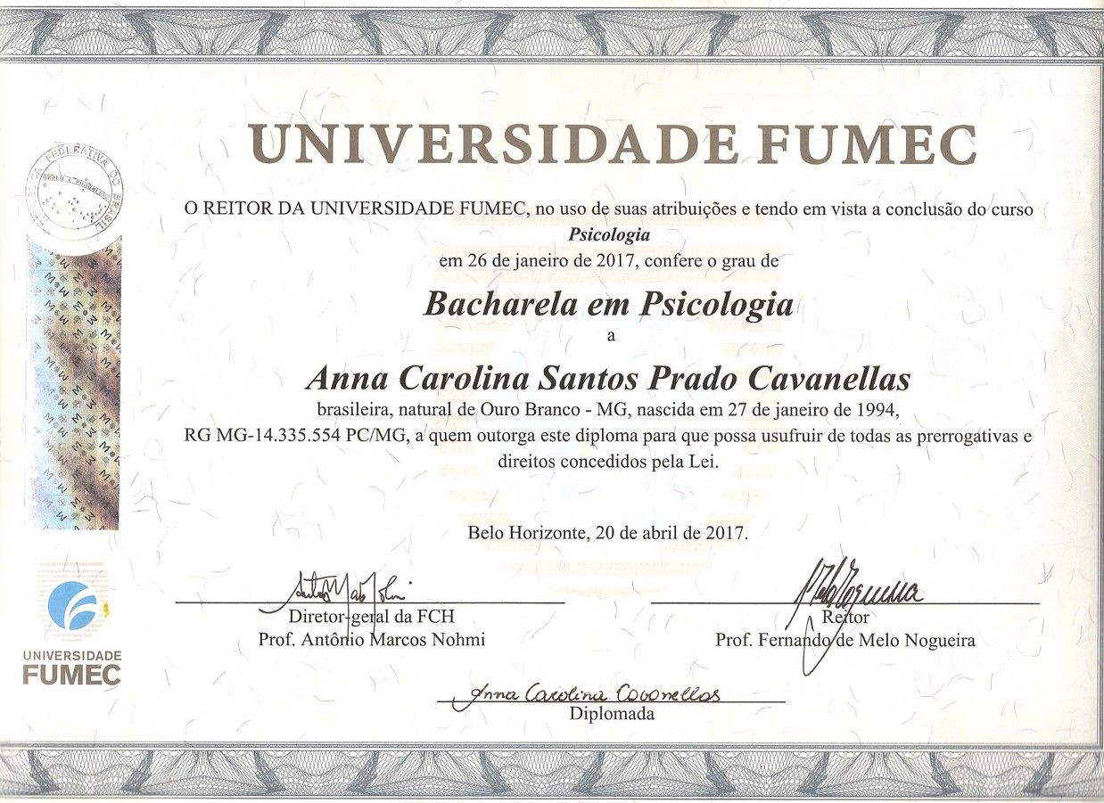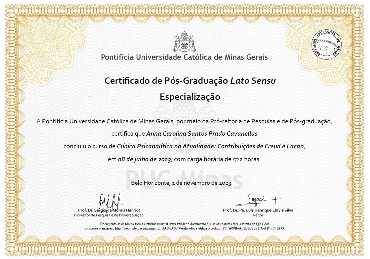 Tenho especialização em Clínica Psicanalítica na Atualidade e me mantenho em contínua formação, participando de seminários e núcleos de pesquisa na Escola Brasileira de Psicanálise (EBP) e no Instituto de Psicanálise e Saúde Mental de Minas Gerais (IPSMMG).