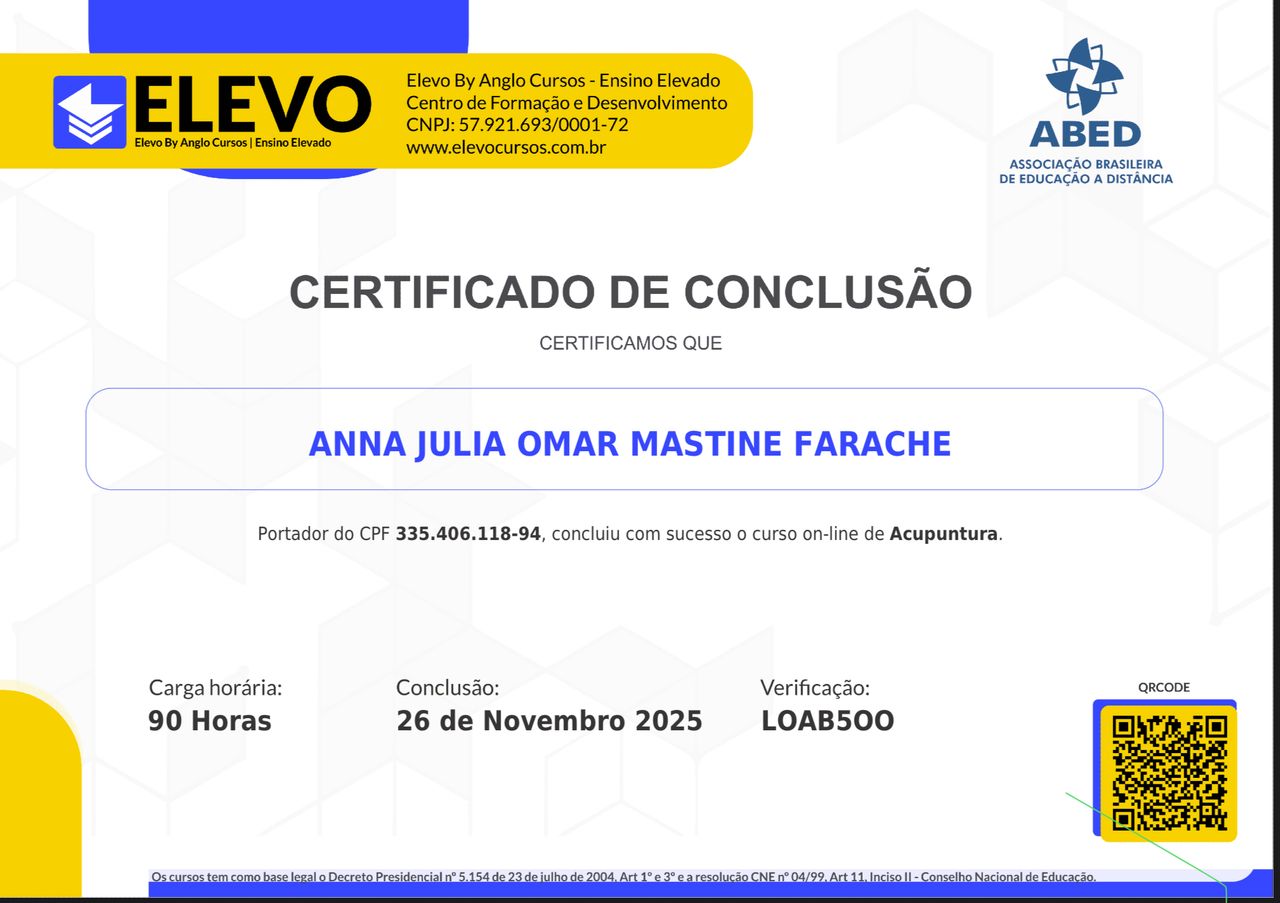 Concluí cursos nas áreas de Acupuntura, Medicina Chinesa e Medicina Integrativa pela ELEVO.