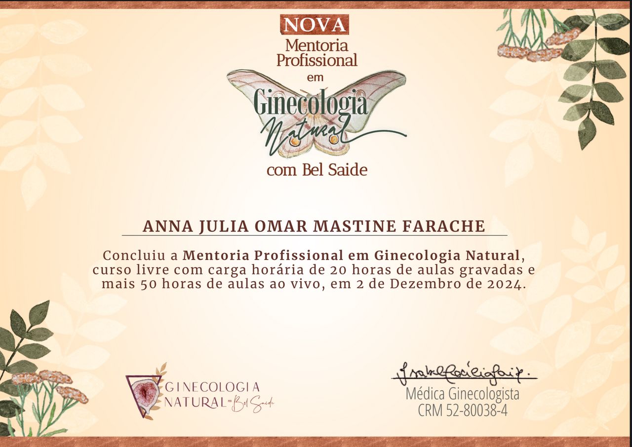 Ademais, realizei a Mentoria em Ginecologia Natural com a ginecologista Bel Saíde, pioneira nessa abordagem no Brasil.