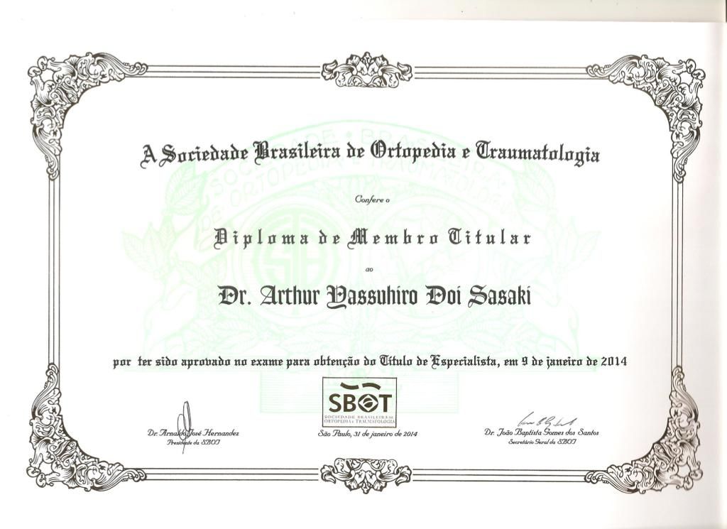 Quais são as principais especialidades de Arthur Yassuhiro Doi Sasaki?Arthur Yassuhiro Doi Sasaki é ortopedista - traumatologista. Te mostramos alguns dos serviços oferecidos pelo especialista graças à sua trajetória e vasta experiência: Primeira consulta ortopedia e traumatologia, Artrodese do cotovelo, Artrodese do joelho, Artrodese do punho (radio-carpica), Artrodese do tornozelo, Artrodese do tornozelo (tibio-tarsica) em geral, Artrodese do tornozelo entre a tibia e outros ossos do tarso, Artrodese Entre Os Ossos Do Punho (Intra-Carpica), Artrodese Escapulo-Toracica, Artrodese escapuloumeral.