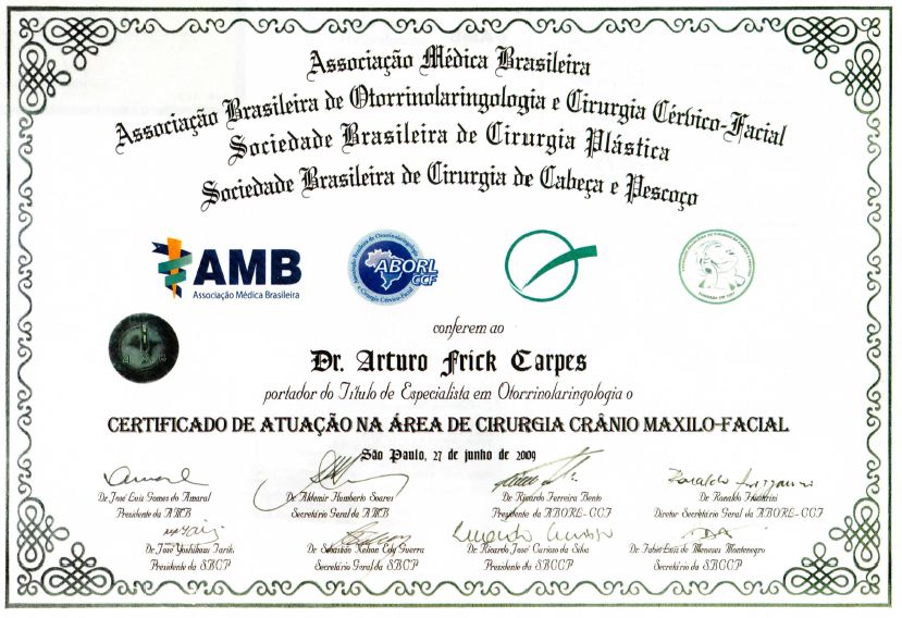 Quais são as principais especialidades de Arturo Frick Carpes?Arturo Frick Carpes é otorrino, cirurgião cranio-maxilo-facial, médico do sono. Te mostramos alguns dos serviços oferecidos pelo especialista graças à sua trajetória e vasta experiência: Teleconsulta, Retorno de consultas Cirurgia Cranio-Maxilo-Facial, Rinoplastia, Cirurgia Ortognatica para Maxilar ou Maxilomandibular, Sinusotomia Maxilar, Primeira consulta Otorrinolaringologia, Consulta Otorrinolaringologia, Retorno de consultas Otorrinolaringologia, Aplicação da toxina botulínica, Frenectomia Labial.