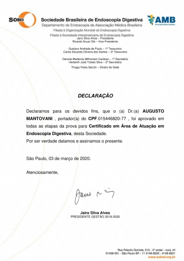 Quais são as principais especialidades de Augusto Mantovani?Augusto Mantovani é gastroenterologista, endoscopista, hepatologista. Te mostramos alguns dos serviços oferecidos pelo especialista graças à sua trajetória e vasta experiência: Primeira consulta gastroenterologia, Consulta Gastroenterologia, Retorno de consultas Gastroenterologia, Colonoscopia do Cólon , Endoscopia digestiva alta, Consulta gastroenterologista.