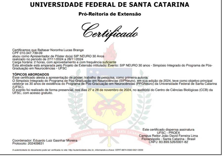 Pesquisador pelo Programa de Mestrado de Neurociências da Universidade Federal de Santa Catarina (UFSC), com foco em Autimo em Adultos, analisando possíveis biomarcadores e correlacionando com parâmetros Neuropsicológicos.