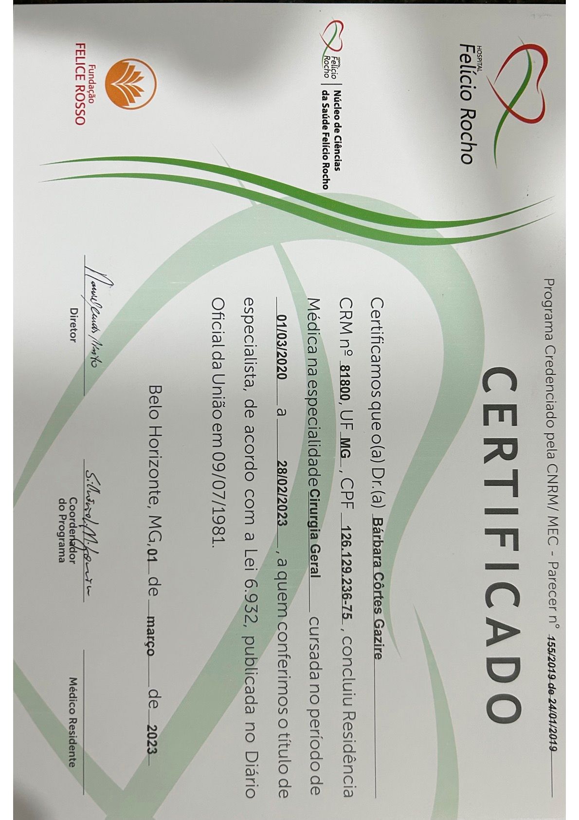 Quais são as principais especialidades de Bárbara Côrtes Gazire?Bárbara Côrtes Gazire é cirurgiã geral. Te mostramos alguns dos serviços oferecidos pelo especialista graças à sua trajetória e vasta experiência: Primeira consulta Cirurgia do Aparelho Digestivo, Consulta Cirurgia Geral, Primeira Consulta Cirurgia Geral, Digestiva e Bariátrica, Avaliação clínica e cirúrgica de doenças do aparelho digestivo, Teleconsulta.