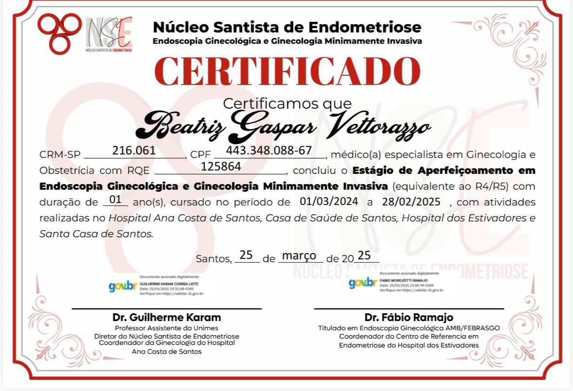 Médica especialista em Ginecologia e Obstetrícia, com aperfeiçoamento em Endoscopia Ginecológica e Ginecologia Minimamente Invasiva na equipe cirúrgica do Núcleo Santista de Endometriose.
